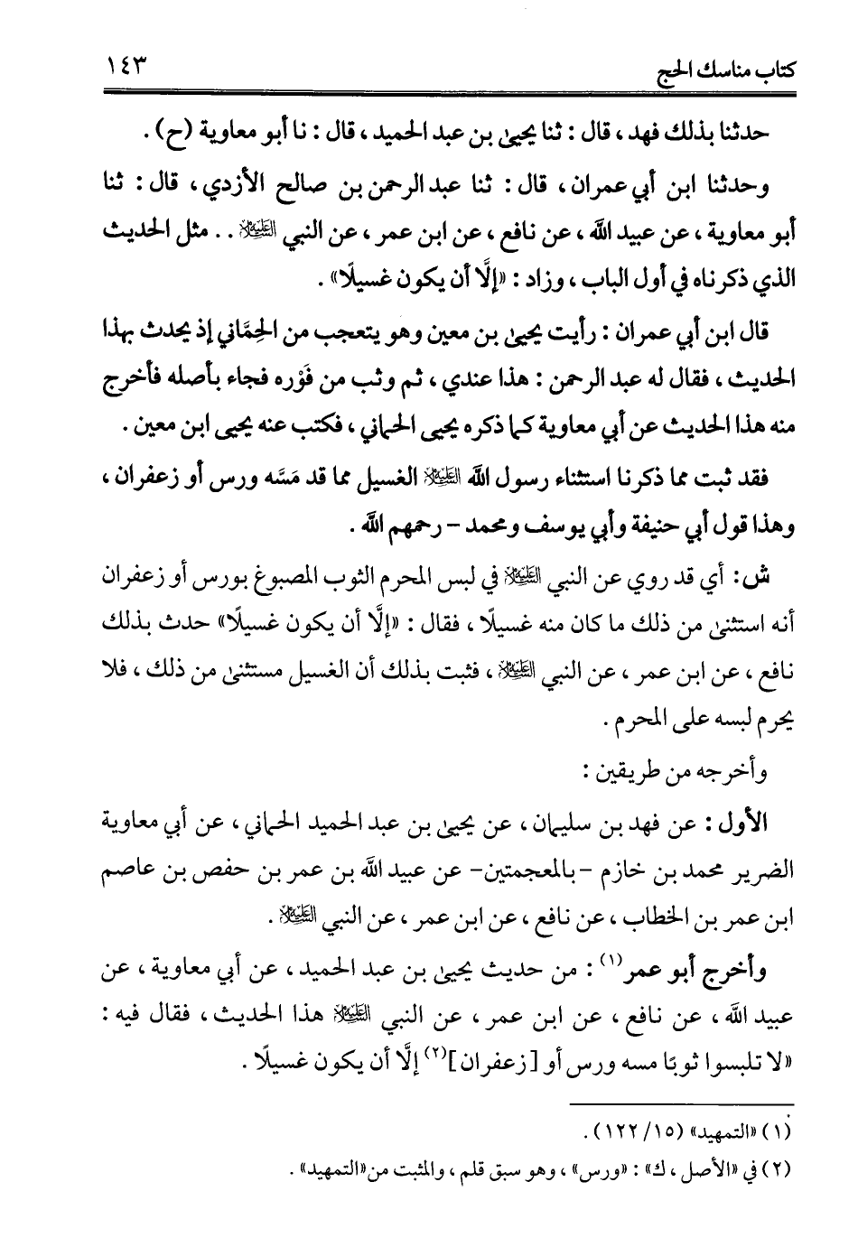 وأخرج أبو عمر (¬1): من حديث يحيى بن عبد الحميد، عن أبي معاوية، عن عبيد الله، عن نافع، عن ابن عمر، عن النبي -عليه السلام- هذا الحديث، فقال فيه: "لا تلبسوا ثوبًا مسه ورس أو [زعفران] (¬2) إلاَّ أن يكون غسيلًا.