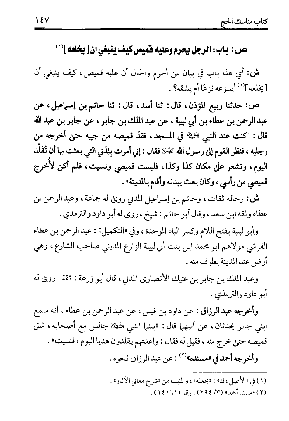 ص: حدثنا ربيع المؤذن، قال: ثنا أسد، قال: ثنا حاتم بن إسماعيل، عن عبد الرحمن بن عطاء بن أبي لبيبة، عن عبد الملك بن جابر، عن جابر بن عبد الله قال: "كنت عند النبي - صلى الله عليه وسلم - في المسجد، فقدّ قميصه من جيبه حتى أخرجه من رجليه، فنظر القوم إلى رسول الله -عليه السلام- فقال: إني أمرت بِبُدْني التي بعثت بها أن تُقَلَّد اليوم، وتشعر على مكان كذا وكذا، فلبست قميصي ونسيت، فلم كن لأُخرج قميصي من رأسي، وكان بعث ببدنه وأقام بالمدينة".