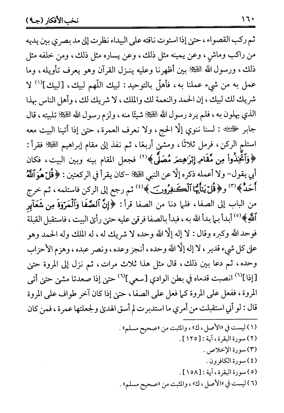 ثم ركب القصواء، حتى إذا استوت ناقته على البيداء نظرت إلى مد بصري بين يديه من راكب وماشٍ، وعن يمينه مثل ذلك، وعن يساره مثل ذلك، ومن خلفه مثل ذلك، ورسول الله -عليه السلام- بين أظهرنا وعليه ينزل القرآن وهو يعرف تأويله، وما عمل به من شيء عملنا به، فأهلّ بالتوحيد: لبيك اللهم لبيك، [لبيك] (¬1) لا شريك لك لبيك، إن الحمد والنعمة لك والملك، لا شريك لك، وأهل الناس بهذا الذي يهلون به، فلم يرد رسول الله -عليه السلام- شيئاً منه، ولزم رسول الله -عليه السلام- تلبيته، قال جابر -رضي الله عنه-: لسنا ننوي إلاَّ الحج، ولا نعرف العمرة، حتى إذا أتينا البيت معه استلم الركن، فرمل ثلاثًا، ومشى أربعًا، ثم نفذ إلى مقام إبراهيم -عليه السلام- فقرأ: {وَاتَّخِذُوا مِنْ مَقَامِ إِبْرَاهِيمَ مُصَلًّى} (¬2) فجعل المقام بينه وبين البيت، فكان أبي يقول -ولا أعمله ذكره إلاَّ عن النبي -عليه السلام-- كان يقرأ في الركعتين: {قُلْ هُوَ اللَّهُ أَحَدٌ} (¬3) و {قُلْ يَا أَيُّهَا الْكَافِرُونَ} (¬4) ثم رجع إلى الركن فاستلمه، ثم خرج من الباب إلى الصفا، فلما دنا من الصفا قرأ: {إِنَّ الصَّفَا وَالْمَرْوَةَ مِنْ شَعَائِرِ اللَّهِ} (¬5) أبدأ بما بدأ الله به، فبدأ بالصفا فرقى عليه حتى رأى البيت، فاستقبل القبلة فوحد الله وكبره وقال: لا إله إلاَّ الله وحده لا شريك له، له الملك وله الحمد وهو على كل شيء قدير، لا إله إلاَّ الله وحده، أنجز وعده، ونصر عبده، وهزم الأحزاب وحده، ثم دعا بين ذلك، قال مثل هذا ثلاث مرات، ثم نزل إلى المروة حتى [إذا] (¬6) انصبت قدماه في بطن الوادي [سعي] (6) حتى إذا صعدتا مشى حتى أتى المروة، ففعل على المروة كما فعل على الصفا، حتى إذا كان آخر طواف على المروة قال: لو أني استقبلت من أمري ما استدبرت لم أسق الهدى ولجعلتها عمرة، فمن كان