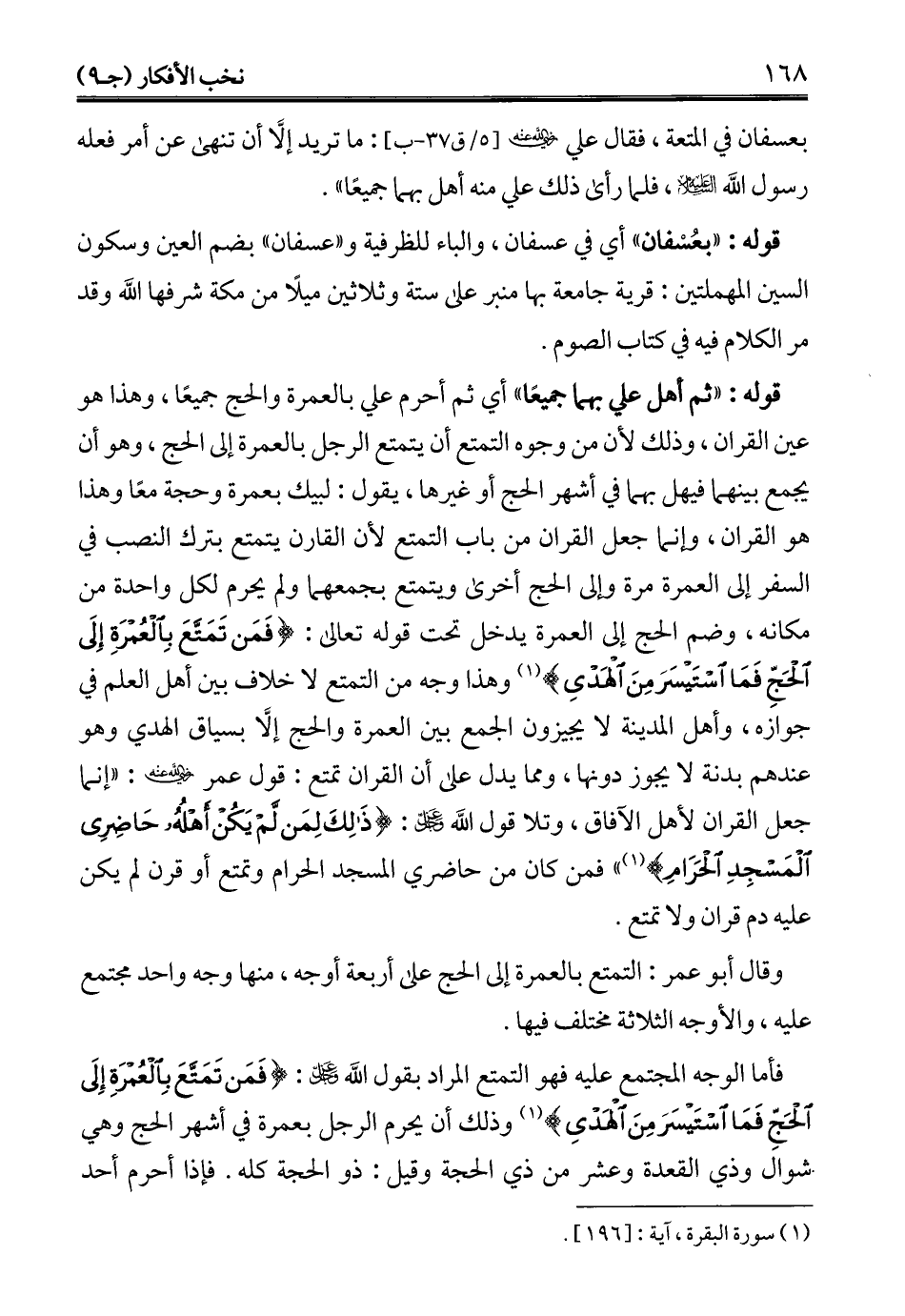 بعسفان في المتعة، فقال علي -رضي الله عنه-: ما تريد إلاَّ أن تنهى عن أمر فعله رسول الله -عليه السلام-، فلما رأى ذلك علي منه أهل بهما جميعًا".