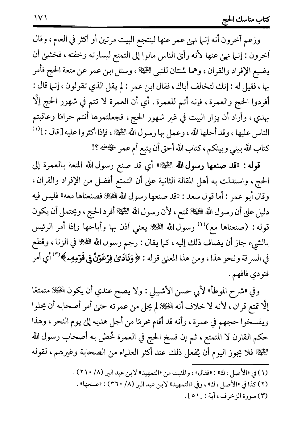 وزعم آخرون أنه إنما نهى عمر عنها لينتجع البيت مرتين أو أكثر في العام، وقال آخرون: إنما نهى عنها لأنه رأى الناس مالوا إلى التمتع ليسارته وخفته، فخشى أن يضيع الإِفراد والقران، وهما سُنتان للنبي -عليه السلام-، وسئل ابن عمر عن متعة الحج فأمر بها، فقيل له: إنك لتخالف أباك، فقال ابن عمر: لم يقل الذي تقولون، إنما قال: أفردوا الحج والعمرة، فإنه أتم للعمرة. أي أن العمرة لا تتم في شهور الحج إلاَّ بهدي، وأراد أن يزار البيت في غير شهور الحج، فجعلتموها أنتم حرامًا وعاقبتم الناس عليها، وقد أحلها الله، وعمل بها رسول الله -عليه السلام-، فإذا أكثروا عليه [قال:] (¬1) كتاب الله بيني وبينكم، كتاب الله أحق أن يتبع أم عمر -رضي الله عنه-؟!