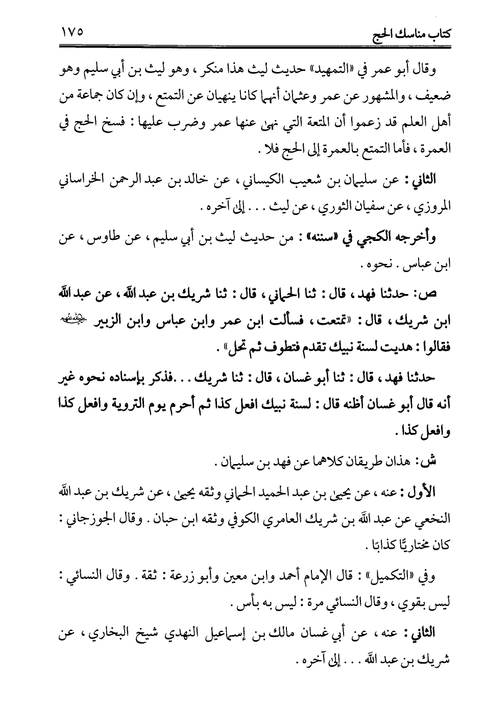 حدثنا فهد، قال: ثنا أبو غسان، قال: ثنا شريك ... فذكر بإسناده نحوه غير أنه قال أبو غسان أظنه قال: لسنة نبيك افعل كذا ثم أحرم يوم التروية وافعل كذا وافعل كذا.
