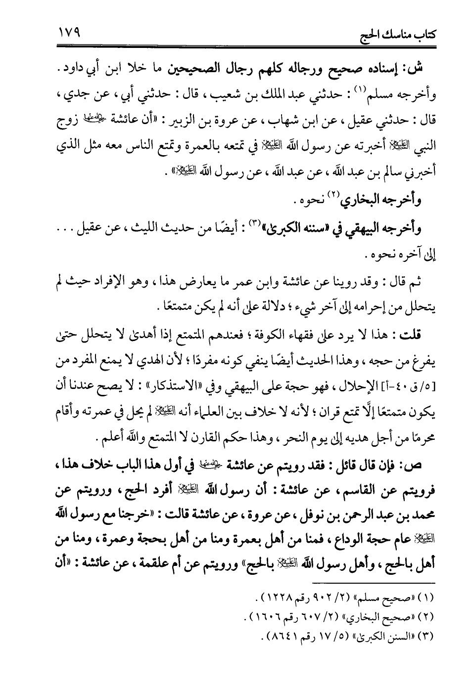 قلت: هذا لا يرد على فقهاء الكوفة؛ فعندهم المتمتع إذا أهدى لا يتحلل حتى يفرغ من حجه، وهذا الحديث أيضًا ينفي كونه مفردًا؛ لأن الهدي لا يمنع المفرد من الإِحلال، فهو حجة على البيهقي وفي "الاستذكار": لا يصح عندنا أن يكون متمتعًا إلاَّ تمتع قران؛ لأنه لا خلاف بين العلماء أنه -عليه السلام- لم يحل في عمرته وأقام محرمًا من أجل هديه إلى يوم النحر، وهذا حكم القارن لا المتمتع والله أعلم.