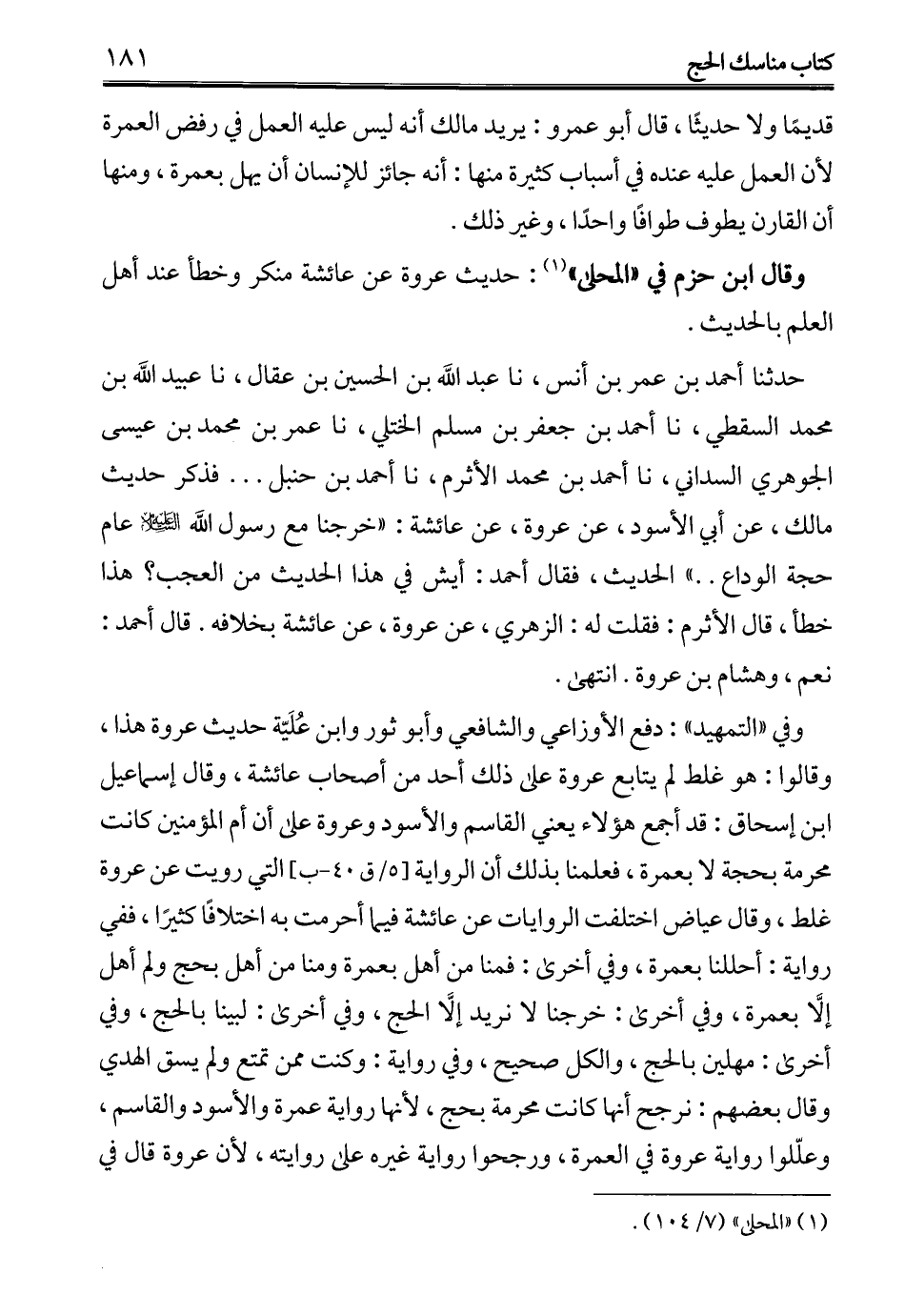 حدثنا أحمد بن عمر بن أنس، نا عبد الله بن الحسين بن عقال، نا عبيد الله بن محمد السقطي، نا أحمد بن جعفر بن مسلم الختلي، نا عمر بن محمد بن عيسى الجوهري السداني، نا أحمد بن محمد الأثرم، نا أحمد بن حنبل ... فذكر حديث مالك، عن أبي الأسود، عن عروة، عن عائشة: "خرجنا مع رسول الله -عليه السلام- عام حجة الوداع .. " الحديث، فقال أحمد: أيش في هذا الحديث من العجب؟ هذا خطأ، قال الأثرم: فقلت له: الزهري، عن عروة، عن عائشة بخلافه. قال أحمد: نعم، وهشام بن عروة. انتهى.