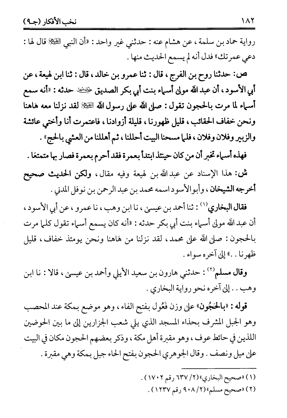 فقال البخاري (¬1): ثنا أحمد بن عيسى، نا ابن وهب، نا عمرو، عن أبي الأسود، أن عبد الله مولى أسماء بنت أبي بكر حدثه: "أنه كان يسمع أسماء تقول كلما مرت بالحجون: صلى الله على محمد، لقد نزلنا من هَا هنا ونحن يومئذ خفاف، قليل ظهرنا .. " إلى آخره سواء.