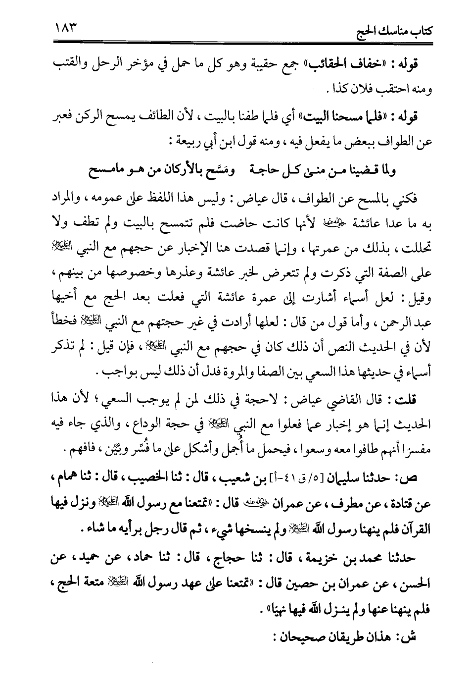 قلت: قال القاضي عياض: لا حجة في ذلك لمن لم يوجب السعي؛ لأن هذا الحديث إنما هو إخبار عما فعلوا مع النبي -عليه السلام- في حجة الوداع، والذي جاء فيه مفسرًا أنهم طافوا معه وسعوا، فيحمل ما أُجمل وأشكل على ما فُسِّر وبُيِّن، فافهم.