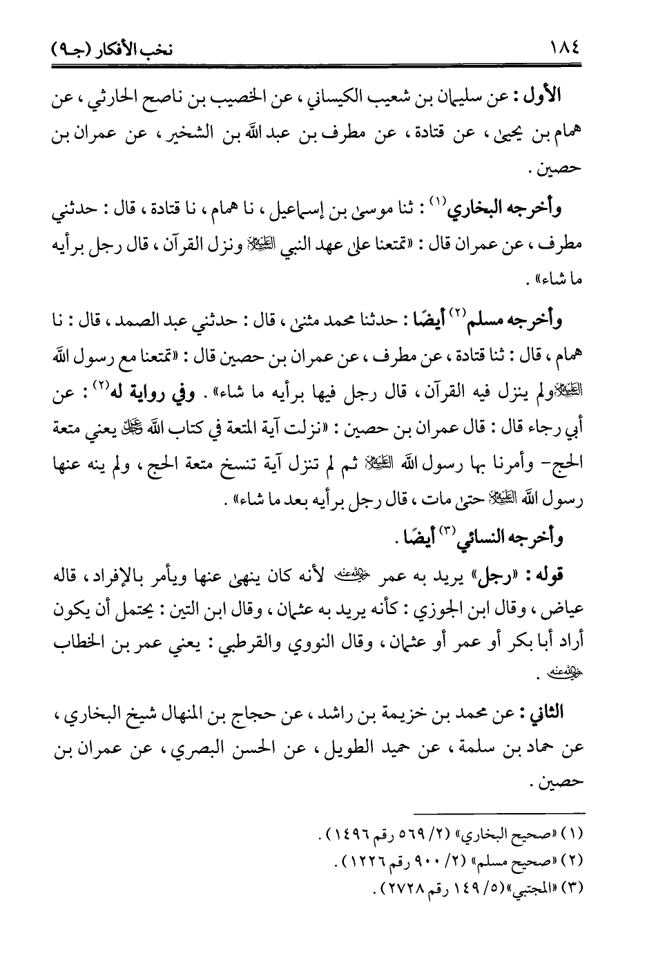 وأخرجه مسلم (¬2) أيضًا: حدثنا محمد مثنى، قال: حدثني عبد الصمد، قال: نا همام، قال: ثنا قتادة، عن مطرف، عن عمران بن حصين قال: "تمتعنا مع رسول الله -عليه السلام- ولم ينزل فيه القرآن، قال رجل فيها برأيه ما شاء". وفي رواية له (2): عن أبي رجاء قال: قال عمران بن حصين: "نزلت آية المتعة في كتاب الله -عز وجل- يعني متعة الحج -وأمرنا بها رسول الله -عليه السلام- ثم لم تنزل آية تنسخ متعة الحج، ولم ينه عنها رسول الله -عليه السلام- حتى مات، قال رجل برأيه بعد ما شاء".