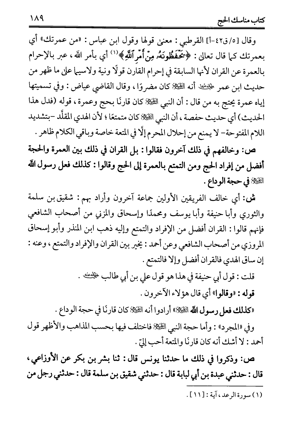 "كللك فعل رسول الله -عليه السلام-" أرادوا أنه -عليه السلام- كان قارنًا في حجة الوداع.