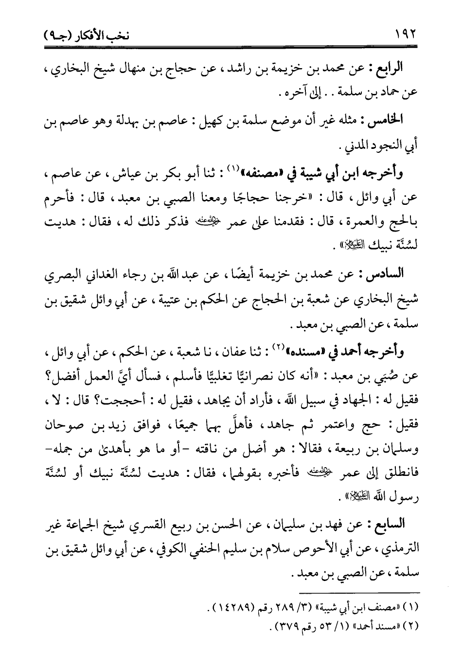 وأخرجه أحمد في "مسنده" (¬2): ثنا عفان، نا شعبة، عن الحكم، عن أبي وائل، عن صُبَي بن معبد: "أنه كان نصرانيًّا تغلبيًّا فأسلم، فسأل أيَّ العمل أفضل؟ فقيل له: الجهاد في سبيل الله، فأراد أن يجاهد، فقيل له: أحججت؟ قال: لا، فقيل: حج واعتمر ثم جاهد، فأهلَّ بهما جميعًا، فوافق زيد بن صوحان وسلمان بن ربيعة، فقالا: هو أضل من ناقته -أو ما هو بأهدى من جمله- فانطلق إلى عمر -رضي الله عنه- فأخبره بقولهما، فقال: هديت لسُنَّة نبيك أو لسُنَّة رسول الله -عليه السلام-".