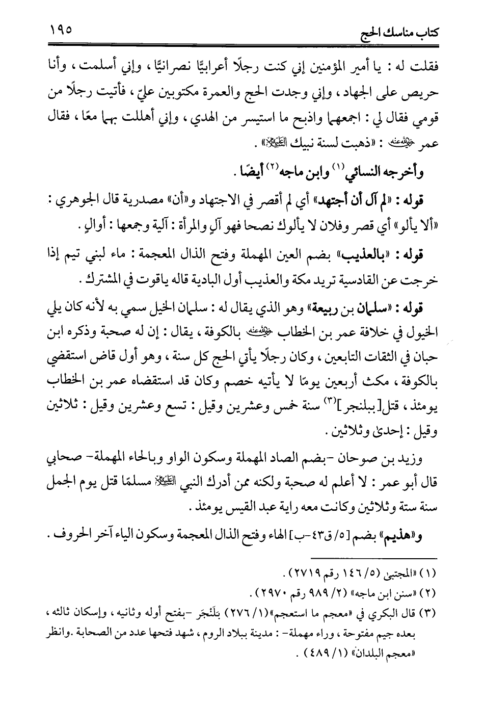 فقلت له: يا أمير المؤمنين إني كنت رجلاً أعرابيًّا نصرانيًّا، وإني أسلمت، وأنا حريص على الجهاد، وإني وجدت الحج والعمرة مكتوبين عليّ، فأتيت رجلاً من قومي فقال لي: اجمعهما واذبح ما استيسر من الهدي، وإني أهللت بهما معًا، فقال عمر -رضي الله عنه-: "ذهبت لسنة نبيك -عليه السلام-".