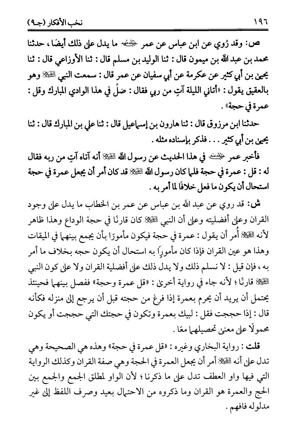 ش: قد روي عن عبد الله بن عباس عن عمر بن الخطاب ما يدل على وجود القران وعلى أفضليته وعلى أن النبي -عليه السلام- كان قارنًا في حجة الوداع وهذا ظاهر لأنه -عليه السلام- أُمر أن يقول: عمرة في حجة فيكون مأمورًا بأن يجمع بينهما في الميقات وهذا هو عين القران فإذا كان مأمورًا به استحال أن يكون حجه بخلاف ما أمر به، فإن قيل: لا نسلم ذلك ولا يدل ذلك على أفضلية القران ولا على كون النبي -عليه السلام- قارنًا؛ لأنه جاء في رواية أخرى: "قل عمرة وحجة" ففصل بينهما فحينئذ يحتمل أن يريد أن يحرم بعمرة إذا فرغ من حجته قبل أن يرجع إلى منزله فكأنه قال: إذا حججت فقل: لبيك بعمرة وتكون في حجتك التي حججت أو يكون محمولًا على معنى تحصيلهما معًا.