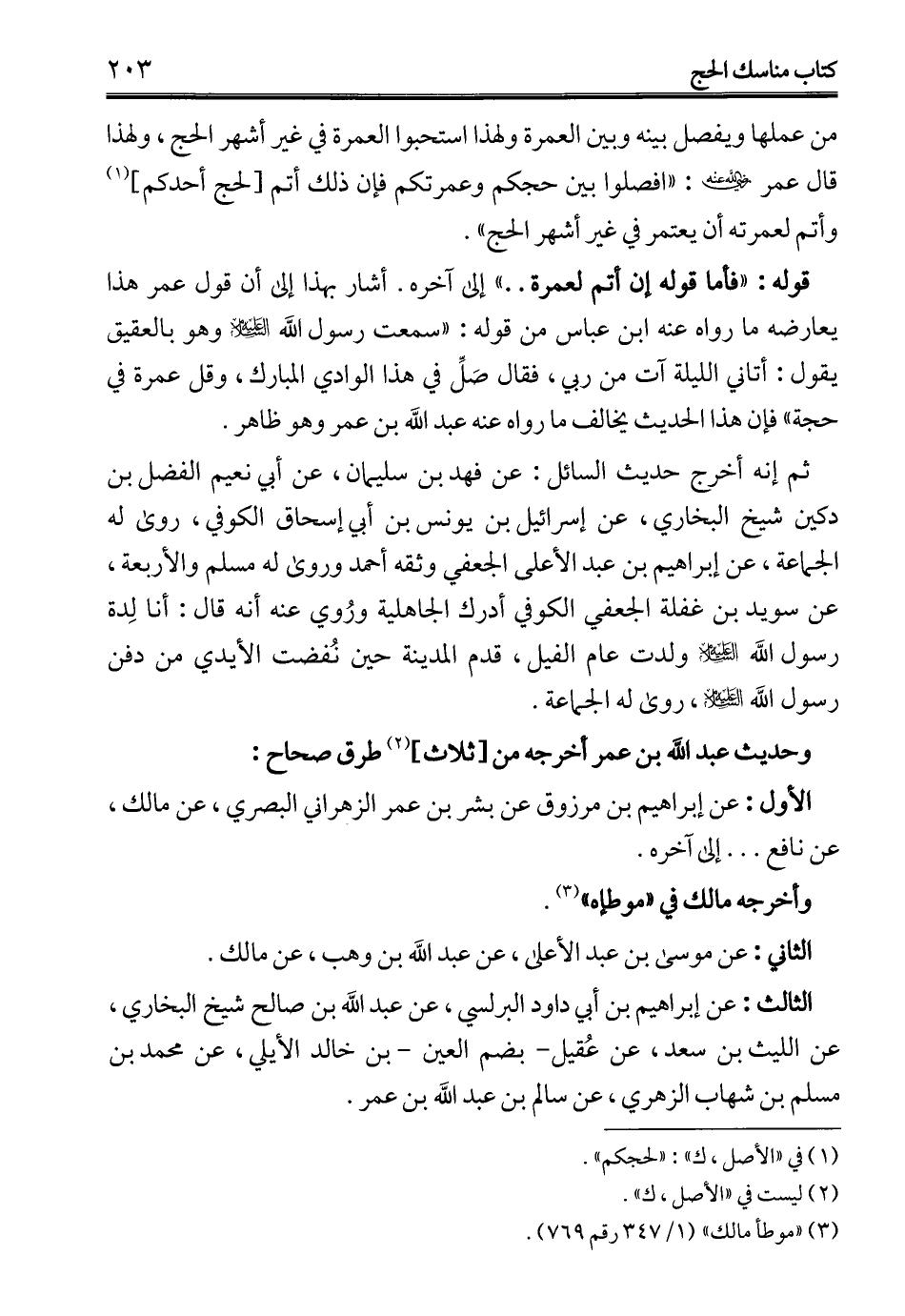 قوله: "فأما قوله إن أتم لعمرة .. " إلي آخره. أشار بهذا إلى أن قول عمر هذا يعارضه ما رواه عنه ابن عباس من قوله: "سمعت رسول الله -عليه السلام- وهو بالعقيق يقول: أتاني الليلة آت من ربي، فقال صَلِّ في هذا الوادي المبارك، وقل عمرة في حجة" فإن هذا الحديث يخالف ما رواه عنه عبد الله بن عمر وهو ظاهر.