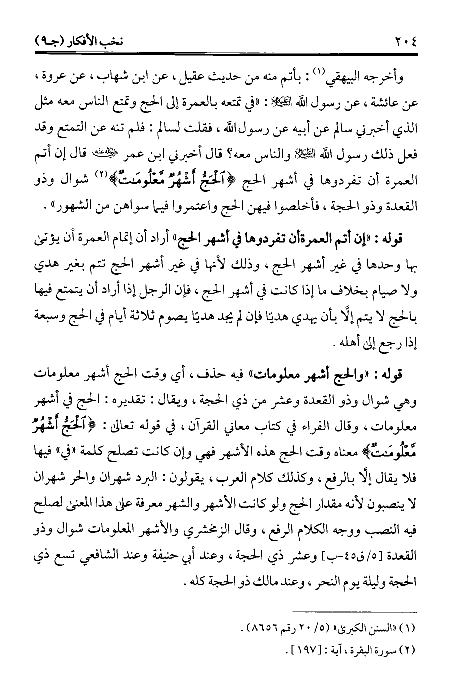 وأخرجه البيهقي (¬1): بأتم منه من حديث عقيل، عن ابن شهاب، عن عروة، عن عائشة، عن رسول الله -عليه السلام-: "في تمتعه بالعمرة إلى الحج وتمتع الناس معه مثل الذي أخبرني سالم عن أبيه عن رسول الله، فقلت لسالم: فلم تنه عن التمتع وقد فعل ذلك رسول الله -عليه السلام- والناس معه؟ قال أخبرني ابن عمر -رضي الله عنه- قال إن أتم العمرة أن تفردوها في أشهر الحج {الْحَجُّ أَشْهُرٌ مَعْلُومَاتٌ} (¬2) شوال وذو القعدة وذو الحجة، فأخلصوا فيهن الحج واعتمروا فيما سواهن من الشهور".