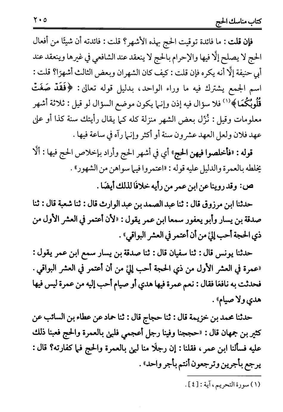 فإن قلت: ما فائدة توقيت الحج بهذه الأشهر؟ قلت: فائدته أن شيئًا من أفعال الحج لا يصلح إلاَّ فيها والإِحرام بالحج لا ينعقد عند الشافعي في غيرها وينعقد عند أبي حنيفة إلاَّ أنه يكره فإن قلت: كيف كان الشهران وبعض الثالث أشهرًا؟ قلت: اسم الجمع يشترك فيه ما وراء الواحد، بدليل قوله تعالى: {فَقَدْ صَغَتْ قُلُوبُكُمَا} (¬1) فلا سؤال فيه إذن وإنما يكون موضع السؤال لو قيل: ثلاثة أشهر معلومات وقيل: نُزِّل بعض الشهر منزلة كله كما يقال رأيتك سنة كذا أو على عهد فلان ولعل العهد عشرون سنة أو أكثر وإنما رآه في ساعة فيها.