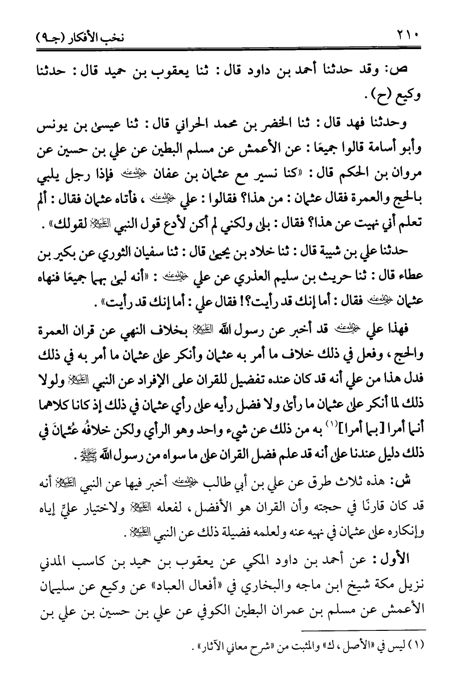 وحدثنا فهد قال: ثنا الخضر بن محمد الحراني قال: ثنا عيسى بن يونس وأبو أسامة قالوا جميعًا: عن الأعمش عن مسلم البطين عن علي بن حسين عن مروان بن الحكم قال: "كنا نسير مع عثمان بن عفان -رضي الله عنه- فإذا رجل يلبي بالحج والعمرة فقال عثمان: من هذا؟ فقالوا: علي -رضي الله عنه-، فأتاه عثمان فقال: ألم تعلم أني نهيت عن هذا؟ فقال: بلى ولكني لم أكن لأدع قول النبي -عليه السلام- لقولك".