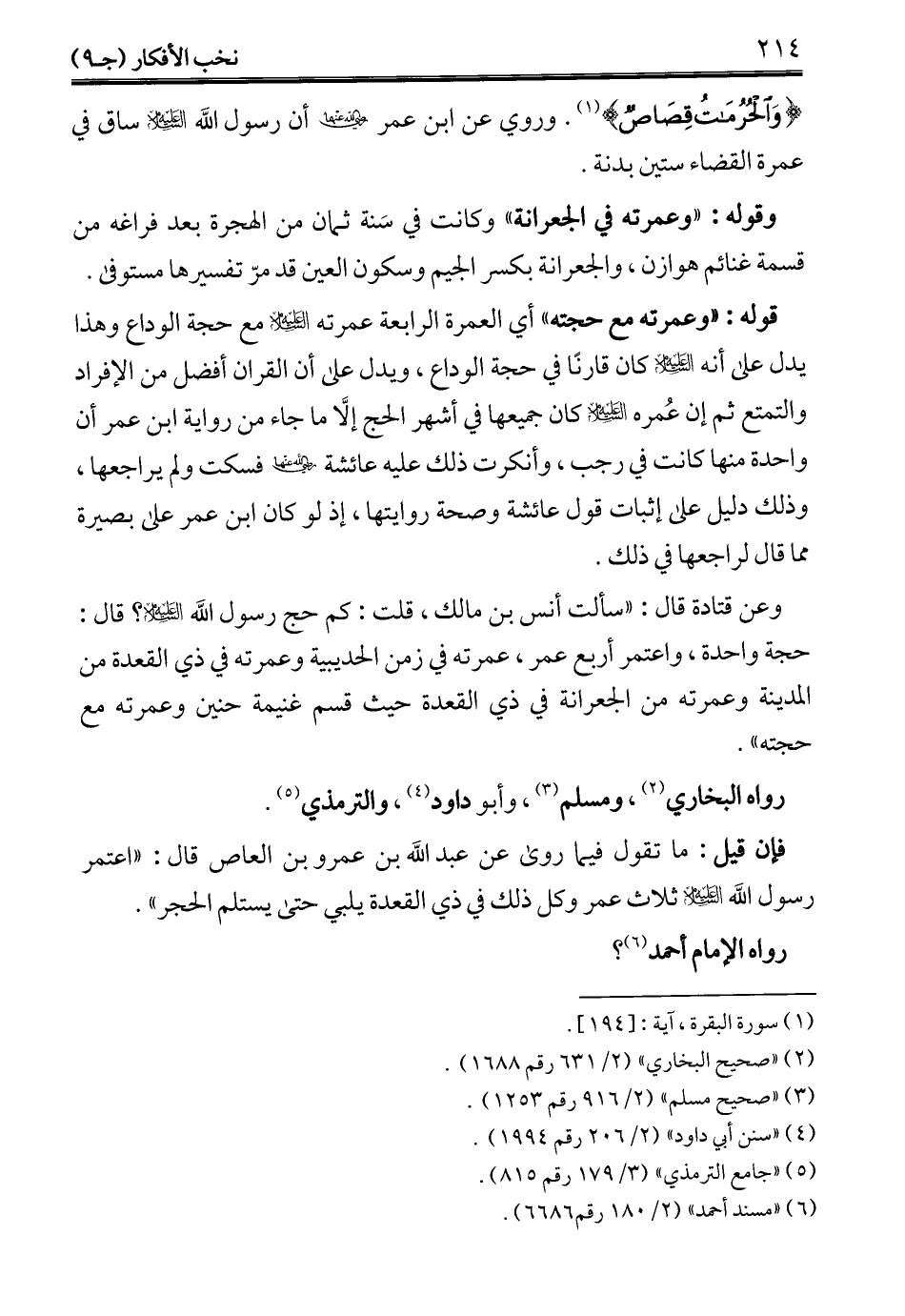 وعن قتادة قال: "سألت أنس بن مالك، قلت: كم حج رسول الله -عليه السلام-؟ قال: حجة واحدة، واعتمر أربع عمر، عمرته في زمن الحديبية وعمرته في ذي القعدة من المدينة وعمرته من الجعرانة في ذي القعدة حيث قسم غنيمة حنين وعمرته مع حجته".
