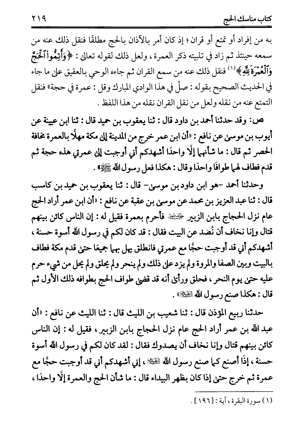 حدثنا ربيع المؤذن قال: ثنا شعيب بن الليث قال: ثنا الليث عن نافع: "أن عبد الله بن عمر أراد الحج عام نزل الحجاج بابن الزبير، فقيل له: إن الناس كائن بينهم قتال وإنا نخاف أن يصدوك فقال: لقد كان لكم في رسول الله أسوة حسنة، إذًا أصنع كما صنع رسول الله -عليه السلام-، إني أشهدكم أني قد أوجبت حجًّا مع عمرة ثم خرج حتى إذا كان بظهر البيداء قال: ما شأن الحج والعمرة إلَّا واحدًا،