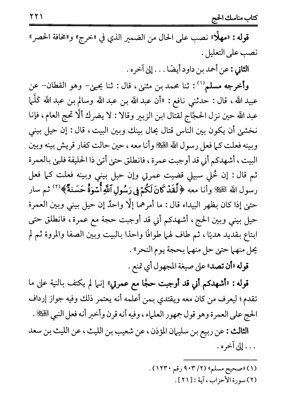 وأخرجه مسلم (¬1): ثنا محمد بن مثنى، قال: ثنا يحيى -وهو القطان- عن عبيد الله، قال: حدثني نافع: "أن عبد الله بن عبد الله وسالم بن عبد الله كَلَّما عبد الله حين نزل الحجَّاج لقتال ابن الزبير وقالا: لا يضرك ألَّا تحج العام، فإنا نخشى أن يكون بين الناس قتال يحال بينك وبين البيت، قال: إن حيل بيني وبينه فعلت كما فعل رسول الله -عليه السلام- وأنا معه، حين حالت كفار قريش بينه وبين البيت، أشهدكم أني قد أوجبت عمرة، فانطلق حتى أتى ذا الحليفة فلبى بالعمرة ثم قال: إن خُلي سبيلي قضيت عمرتي وإن حيل بيني وبينه فعلت كما فعل رسول الله -عليه السلام- وأنا معه {لَقَدْ كَانَ لَكُمْ فِي رَسُولِ اللَّهِ أُسْوَةٌ حَسَنَةٌ} (¬2) ثم سار حتى إذا كان بظهر البيداء قال: ما أمرهما إلَّا واحدٌ إن حيل بيني وبين العمرة حيل بيني وبين الحج، أشهدكم أني قد أوجبت حجة مع عمرة، فانطلق حتى ابتاع بقديد هديًا، ثم طاف لهما طوافًا واحدًا بالبيت وبين الصفا والمروة ثم لم يحل منهما حتى حل منهما بحجة يوم النحر".
