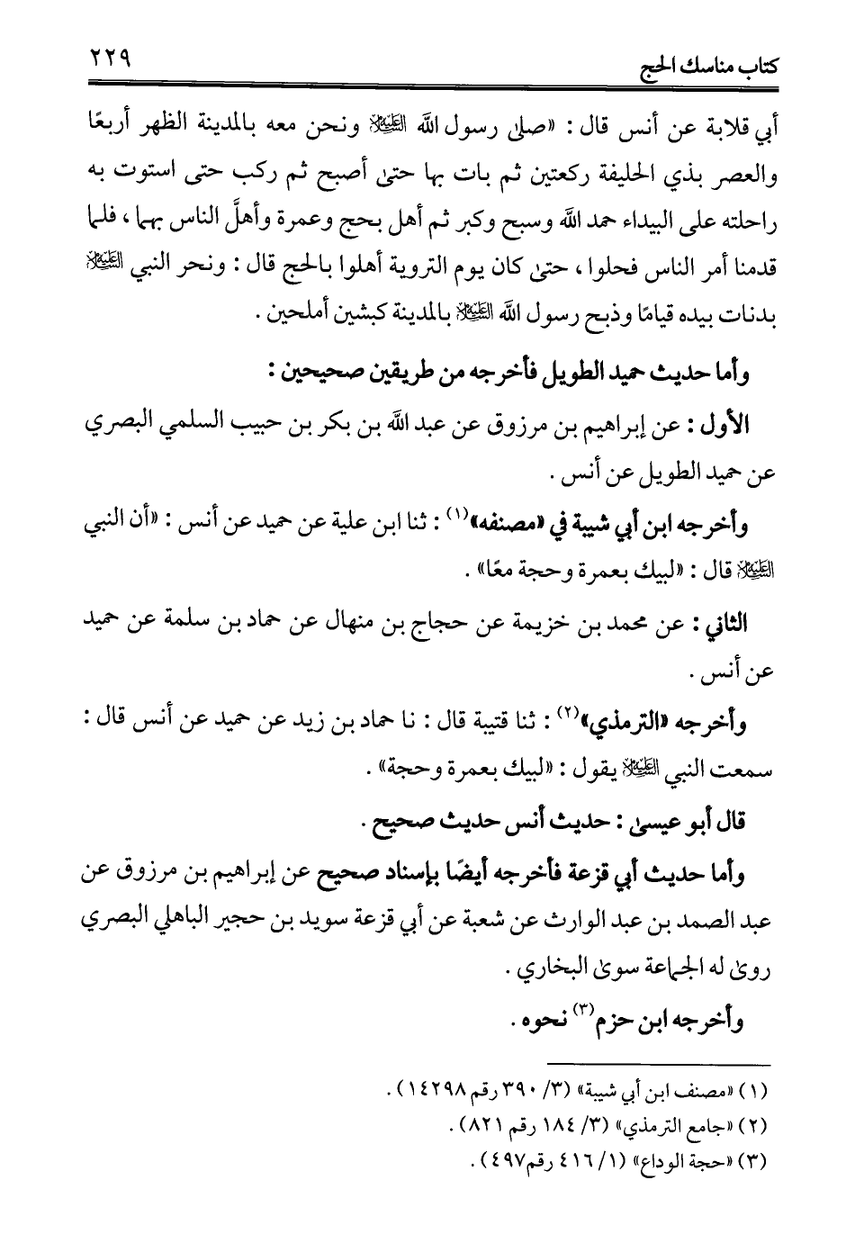 أبي قلابة عن أنس قال: "صلى رسول الله -عليه السلام- ونحن معه بالمدينة الظهر أربعًا والعصر بذي الحليفة ركعتين ثم بات بها حتى أصبح ثم ركب حتى استوت به راحلته على البيداء حمد الله وسبح وكبر ثم أهل بحج وعمرة وأهلَّ الناس بهما، فلما قدمنا أمر الناس فحلوا، حتى كان يوم التروية أهلوا بالحج قال: ونحر النبي -عليه السلام- بدنات بيده قيامًا وذبح رسول الله -عليه السلام- بالمدينة كبشين أملحين.