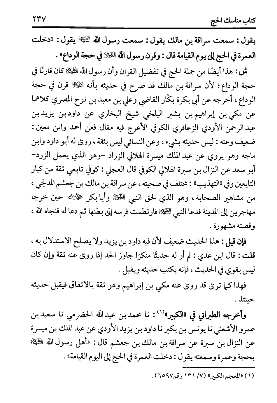 ش: هذا أيضًا من جملة الحج في تفضيل القران وأن رسول الله -عليه السلام- كان قارنًا في حجة الوداع؛ لأن سراقة بن مالك قد صرح في حديثه بأنه -عليه السلام- قرن في حجة الوداع، أخرجه عن أبي بكرة بكَّار القاضي وعلي بن معبد بن نوح المصري كلاهما عن مكي بن إبراهيم بن بشير البلخي شيخ البخاري عن داود بن يزيد بن عبد الرحمن الأودي الزعافري الكوفي الأعرج فيه مقال فعن أحمد وابن معين: ضعيف وعنه: ليس حديثه بشيء، وعن النسائي ليس بثقة، روى له أبو داود وابن ماجه وهو يروي عن عبد الملك ميسرة الهلالي الزراد -وهو الذي يعمل الزرد- أبو سعد عن النزال بن سبرة الهلالي الكوفي قال العجلي: كوفي تابعي ثقة من كبار التابعين وفي "التهذيب": مختلف في صحبته، عن سراقة بن مالك بن جعشم المدلجي، من مشاهير الصحابة، وهو الذي لحق النبي -عليه السلام- وأبا بكر -رضي الله عنه- حين خرجا مهاجرين إلى المدينة فدعا النبي -عليه السلام- فارتطمت فرسه إلى بطنها ثم دعا له فنجاه الله، وقصته مشهورة.