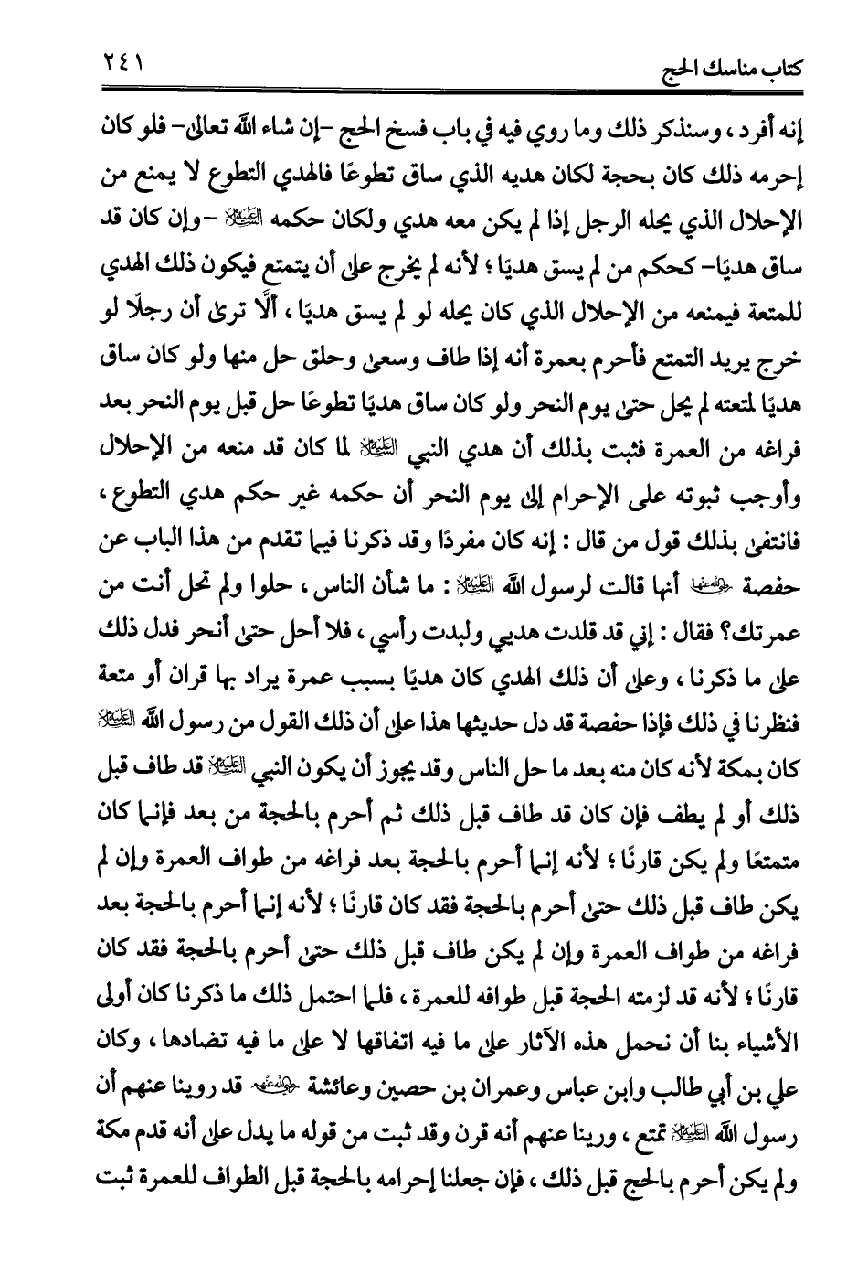 إنه أفرد، وسنذكر ذلك وما روي فيه في باب فسخ الحج -إن شاء الله تعالى- فلو كان إحرمه ذلك كان بحجة لكان هديه الذي ساق تطوعًا فالهدي التطوع لا يمنع من الإِحلال الذي يحله الرجل إذا لم يكن معه هدي ولكان حكمه -عليه السلام-وإن كان قد ساق هديًا- كحكم من لم يسق هديًا؛ لأنه لم يخرج على أن يتمتع فيكون ذلك الهدي للمتعة فيمنعه من الإِحلال الذي كان يحله لو لم يسق هديًا، ألَّا ترى أن رجلاً لو خرج يريد التمتع فأحرم بعمرة أنه إذا طاف وسعى وحلق حل منها ولو كان ساق هديًا لمتعته لم يحل حتى يوم النحر ولو كان ساق هديًا تطوعًا حل قبل يوم النحر بعد فراغه من العمرة فثبت بذلك أن هدي النبي -عليه السلام- لما كان قد منعه من الإِحلال وأوجب ثبوته على الإِحرام إلى يوم النحر أن حكمه غير حكم هدي التطوع، فانتفى بذلك قول من قال: إنه كان مفردًا وقد ذكرنا فيما تقدم من هذا الباب عن حفصة -رضي الله عنها- أنها قالت لرسول الله -عليه السلام-: ما شأن الناس، حلوا ولم تحل أنت من عمرتك؟ فقال: إني قد قلدت هديي ولبدت رأسي، فلا أحل حتى أنحر فدل ذلك على ما ذكرنا، وعلى أن ذلك الهدي كان هديًا بسبب عمرة يراد بها قران أو متعة فنظرنا في ذلك فإذا حفصة قد دل حديثها هذا على أن ذلك القول من رسول الله -عليه السلام- كان بمكة لأنه كان منه بعد ما حل الناس وقد يجوز أن يكون النبي -عليه السلام- قد طاف قبل ذلك أو لم يطف فإن كان قد طاف قبل ذلك ثم أحرم بالحجة من بعد فإنما كان متمتعًا ولم يكن قارنًا؛ لأنه إنما أحرم بالحجة بعد فراغه من طواف العمرة وإن لم يكن طاف قبل ذلك حتى أحرم بالحجة فقد كان قارنًا؛ لأنه إنما أحرم بالحجة بعد فراغه من طواف العمرة وإن لم يكن طاف قبل ذلك حتى أحرم بالحجة فقد كان قارنًا؛ لأنه قد لزمته الحجة قبل طوافه للعمرة، فلما احتمل ذلك ما ذكرنا كان أولى الأشياء بنا أن نحمل هذه الآثار على ما فيه اتفاقها لا على ما فيه تضادها، وكان علي بن أبي طالب وابن عباس وعمران بن حصين وعائشة -رضي الله عنهم- قد روينا عنهم أن رسول الله -عليه السلام- تمتع، ورينا عنهم أنه قرن وقد ثبت من قوله ما يدل على أنه قدم مكة ولم يكن أحرم بالحج قبل ذلك، فإن جعلنا إحرامه بالحجة قبل الطواف للعمرة ثبت
