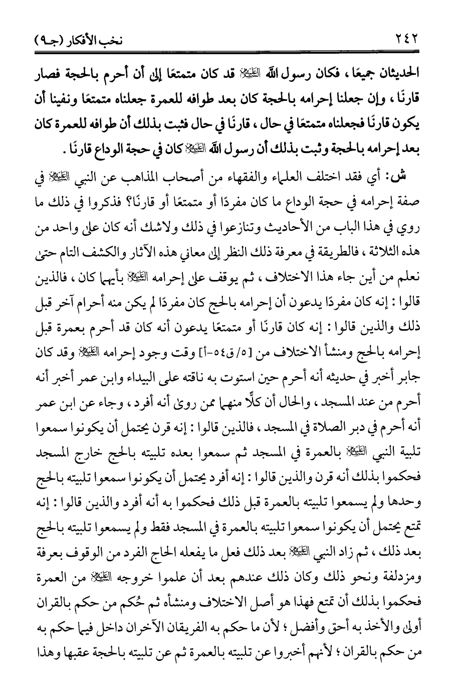 ش: أي فقد اختلف العلماء والفقهاء من أصحاب المذاهب عن النبي -عليه السلام- في صفة إحرامه في حجة الوداع ما كان مفردًا أو متمتعًا أو قارنًا؟ فذكروا في ذلك ما روي في هذا الباب من الأحاديث وتنازعوا في ذلك ولا شك أنه كان على واحد من هذه الثلاثة، فالطريقة في معرفة ذلك النظر إلى معاني هذه الآثار والكشف التام حتى نعلم من أين جاء هذا الاختلاف، ثم يوقف على إحرامه -عليه السلام- بأيهما كان، فالذين قالوا: إنه كان مفردًا يدعون أن إحرامه بالحج كان مفردًا لم يكن منه أحرام آخر قبل ذلك والذين قالوا: إنه كان قارنًا أو متمتعًا يدعون أنه كان قد أحرم بعمرة قبل إحرامه بالحج ومنشأ الاختلاف من وقت وجود إحرامه -عليه السلام- وقد كان جابر أخبر في حديثه أنه أحرم حين استوت به ناقته على البيداء وابن عمر أخبر أنه أحرم من عند المسجد، والحال أن كلاًّ منهما ممن روى أنه أفرد، وجاء عن ابن عمر أنه أحرم في دبر الصلاة في المسجد، فالذين قالوا: إنه قرن يحتمل أن يكونوا سمعوا تلبية النبي -عليه السلام- بالعمرة في المسجد ثم سمعوا بعده تلبيته بالحج خارج المسجد فحكموا بذلك أنه قرن والذين قالوا: إنه أفرد يحتمل أن يكونوا سمعوا تلبيته بالحج وحدها ولم يسمعوا تلبيته بالعمرة قبل ذلك فحكموا به أنه أفرد والذين قالوا: إنه تمتع يحتمل أن يكونوا سمعوا تلبيته بالعمرة في المسجد فقط ولم يسمعوا تلبيته بالحج بعد ذلك، ثم زاد النبي -عليه السلام- بعد ذلك فعل ما يفعله الحاج الفرد من الوقوف بعرفة ومزدلفة ونحو ذلك وكان ذلك عندهم بعد أن علموا خروجه -عليه السلام- من العمرة فحكموا بذلك أن تمتع فهذا هو أصل الاختلاف ومنشأه ثم حُكم من حكم بالقران أولى والأخذ به أحق وأفضل؛ لأن ما حكم به الفريقان الآخران داخل فيما حكم به من حكم بالقران؛ لأنهم أخبروا عن تلبيته بالعمرة ثم عن تلبيته بالحجة عقبها وهذا