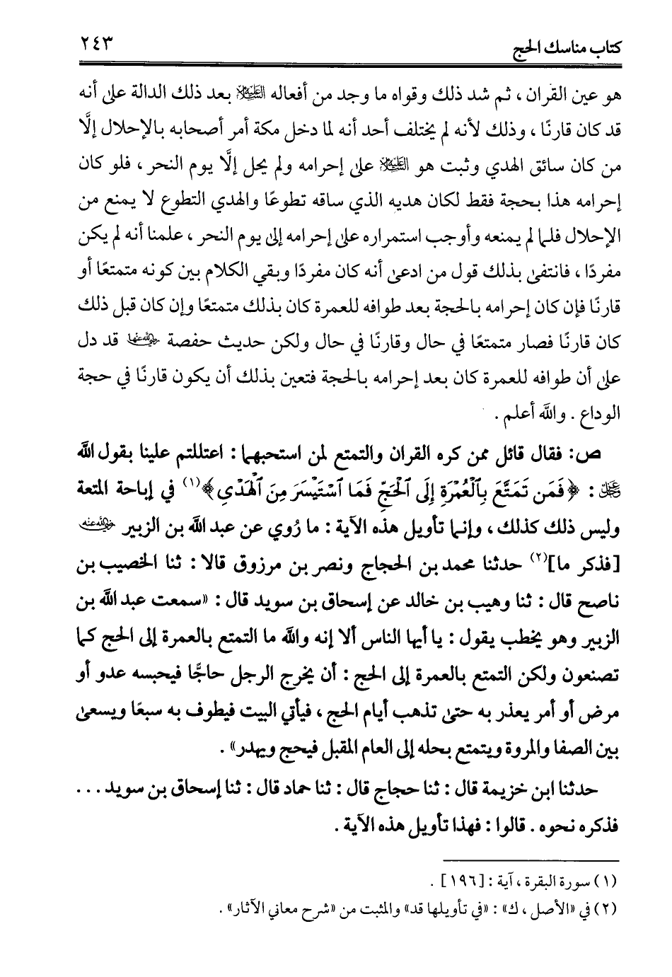 ص: فقال قائل ممن كره القران والتمتع لمن استحبهما: اعتللتم علينا بقول الله -عز وجل-: {فَمَنْ تَمَتَّعَ بِالْعُمْرَةِ إِلَى الْحَجِّ فَمَا اسْتَيْسَرَ مِنَ الْهَدْيِ} (¬1) في إباحة المتعة وليس ذلك كذلك، وإنما تأويل هذه الآية: ما رُوي عن عبد الله بن الزبير -رضي الله عنه-[فذكر ما] (¬2) حدثنا محمد بن الحجاج ونصر بن مرزوق قالا: ثنا الخصيب بن ناصح قال: ثنا وهيب بن خالد عن إسحاق بن سويد قال: "سمعت عبد الله بن الزبير وهو يخطب يقول: يا أيها الناس ألا إنه والله ما التمتع بالعمرة إلى الحج كما تصنعون ولكن التمتع بالعمرة إلى الحج: أن يخرج الرجل حاجًّا فيحبسه عدو أو مرض أو أمر يعذر به حتى تذهب أيام الحج، فيأتي البيت فيطوف به سبعًا ويسعى بين الصفا والمروة ويتمتع بحله إلى العام المقبل فيحج ويهدر".
