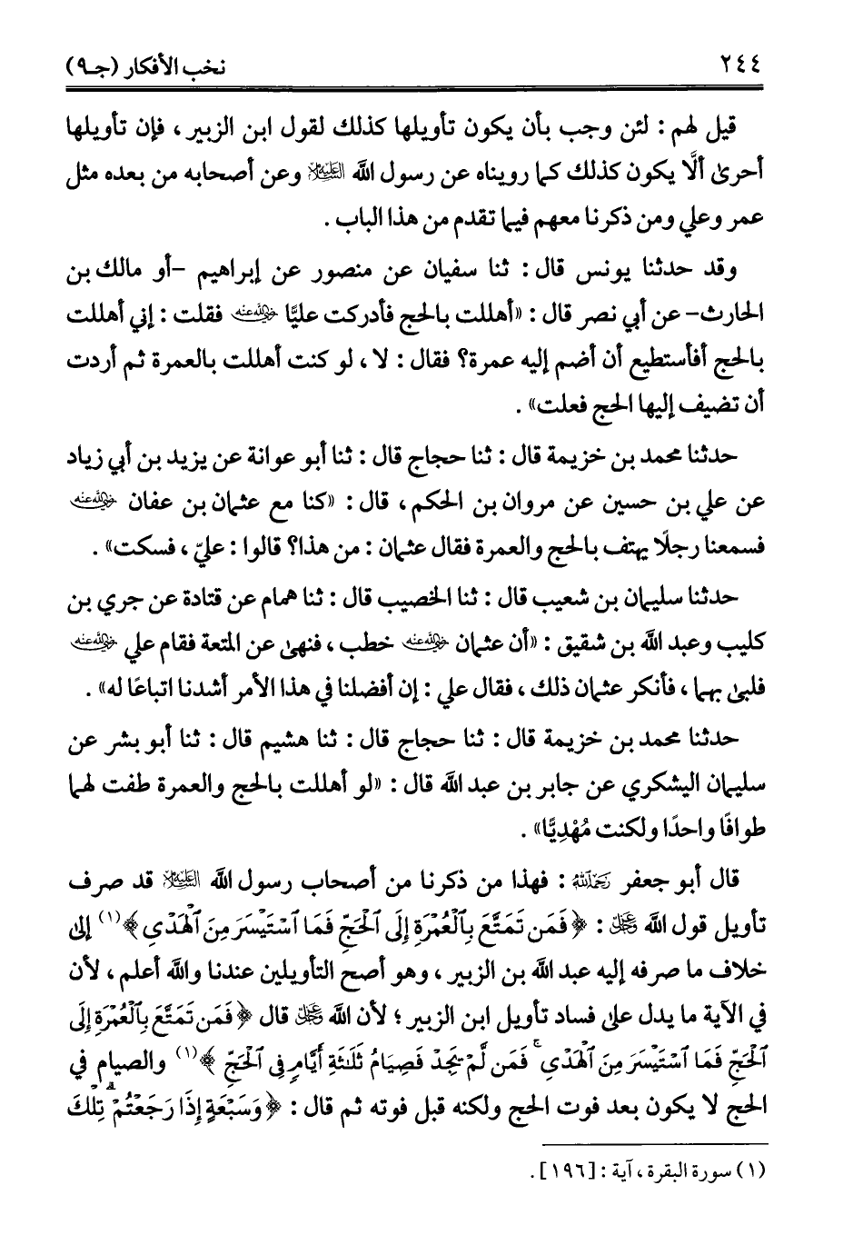 حدثنا محمد بن خزيمة قال: ثنا حجاج قال: ثنا أبو عوانة عن يزيد بن أبي زياد عن علي بن حسين عن مروان بن الحكم، قال: "كنا مع عثمان بن عفان -رضي الله عنه- فسمعنا رجلاً يهتف بالحج والعمرة فقال عثمان: من هذا؟ قالوا: عليّ، فسكت".