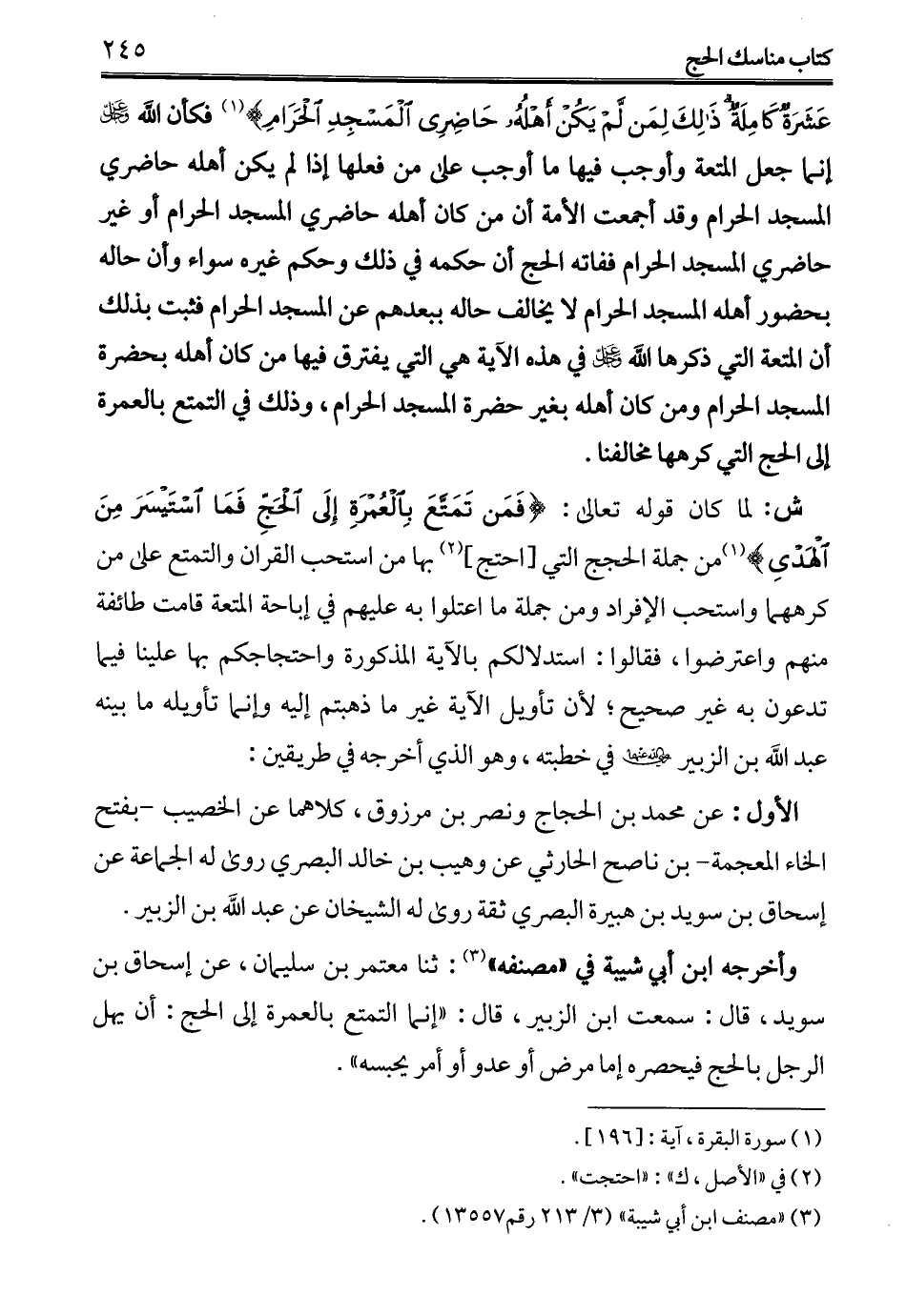كرههما واستحب الإِفراد ومن جملة ما اعتلوا به عليهم في إباحة المتعة قامت طائفة منهم واعترضوا، فقالوا: استدلالكم بالآية المذكورة واحتجاجكم بها علينا فيما تدعون به غير صحيح؛ لأن تأويل الآية غير ما ذهبتم إليه وإنما تأويله ما بينه عبد الله بن الزبير -رضي الله عنهما- في خطبته، وهو الذي أخرجه في طريقين: