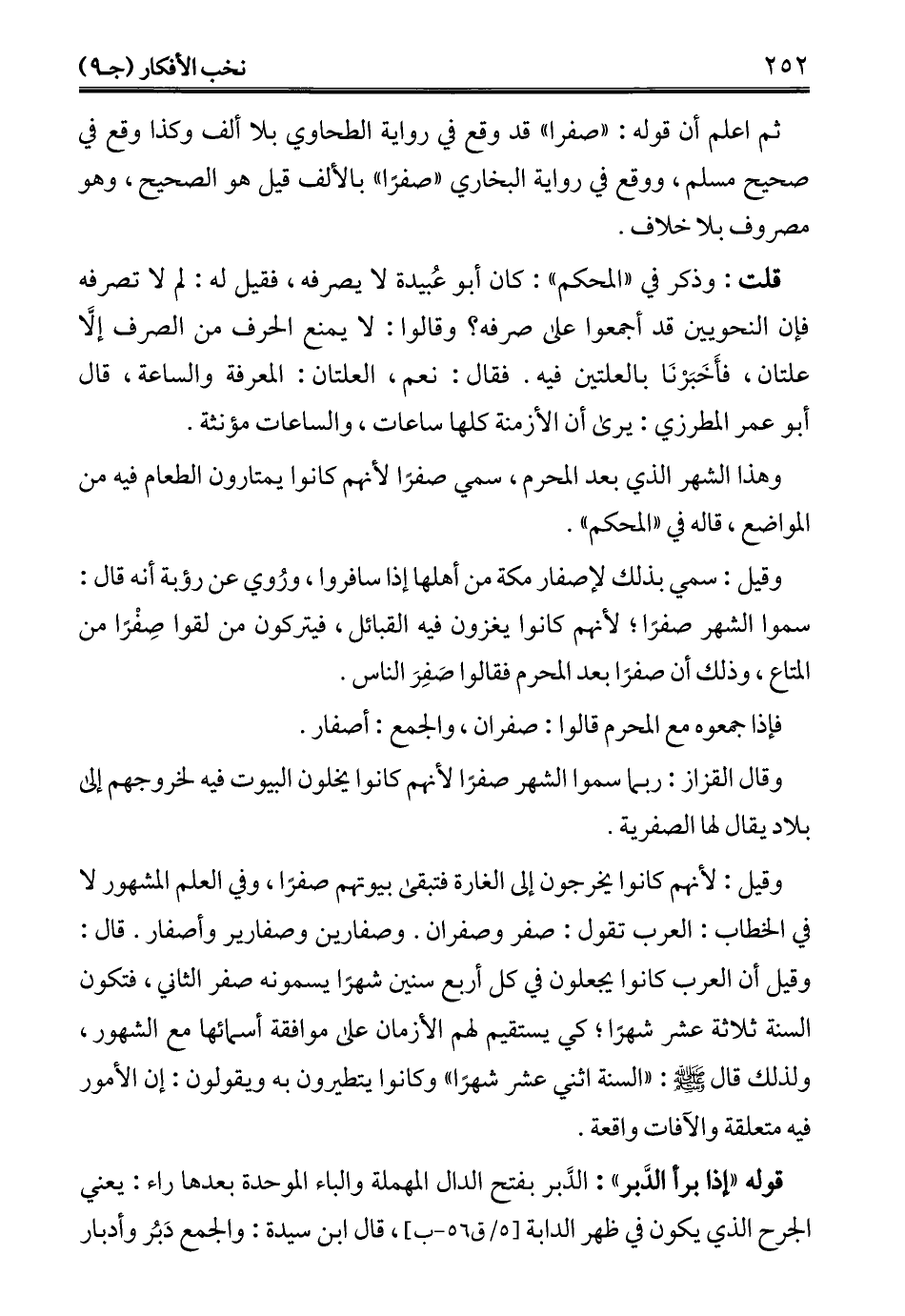 وقيل: لأنهم كانوا يخرجون إلى الغارة فتبقى بيوتهم صفرًا، وفي العلم الشهور لا في الخطاب: العرب تقول: صفر وصفران. وصفارين وصفارير وأصفار. قال: وقيل أن العرب كانوا يجعلون في كل أربع سنين شهرًا يسمونه صفر الثاني، فتكون السنة ثلاثة عشر شهرًا؛ كي يستقيم لهم الأزمان على موافقة أسمائها مع الشهور، ولذلك قال - صلى الله عليه وسلم -: "السنة اثني عشر شهرًا" وكانوا يتطيرون به ويقولون: إن الأمور فيه متعلقة والآفات واقعة.