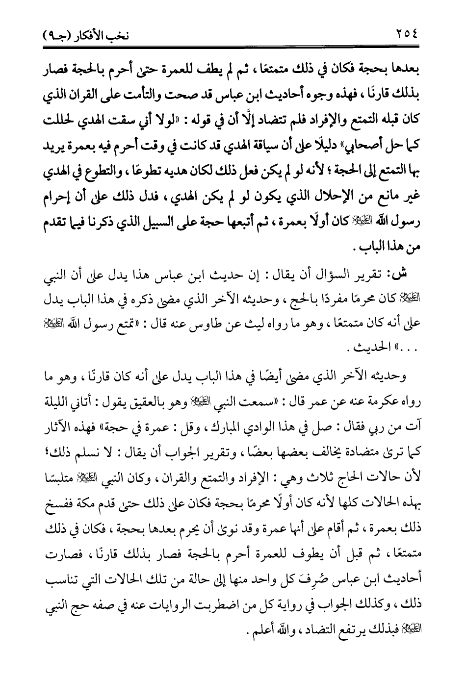 وحديثه الآخر الذي مضى أيضًا في هذا الباب يدل على أنه كان قارنًا، وهو ما رواه عكرمة عنه عن عمر قال: "سمعت النبي -عليه السلام- وهو بالعقيق يقول: أتاني الليلة آت من ربي فقال: صل في هذا الوادي المبارك، وقل: عمرة في حجة" فهذه الآثار كما ترى متضادة يخالف بعضها بعضًا، وتقرير الجواب أن يقال: لا نسلم ذلك؛ لأن حالات الحاج ثلاث وهي: الإِفراد والتمتع والقران، وكان النبي -عليه السلام- متلبسًا بهذه الحالات كلها لأنه كان أولاً محرمًا بحجة فكان على ذلك حتى قدم مكة ففسخ ذلك بعمرة، ثم أقام على أنها عمرة وقد نوى أن يحرم بعدها بحجة، فكان في ذلك متمتعًا، ثم قبل أن يطوف للعمرة أحرم بالحجة فصار بذلك قارنًا، فصارت أحاديث ابن عباس صُرِفَ كل واحد منها إلى حالة من تلك الحالات التي تناسب ذلك، وكذلك الجواب في رواية كل من اضطربت الروايات عنه في صفه حج النبي -عليه السلام- فبذلك يرتفع التضاد، والله أعلم.