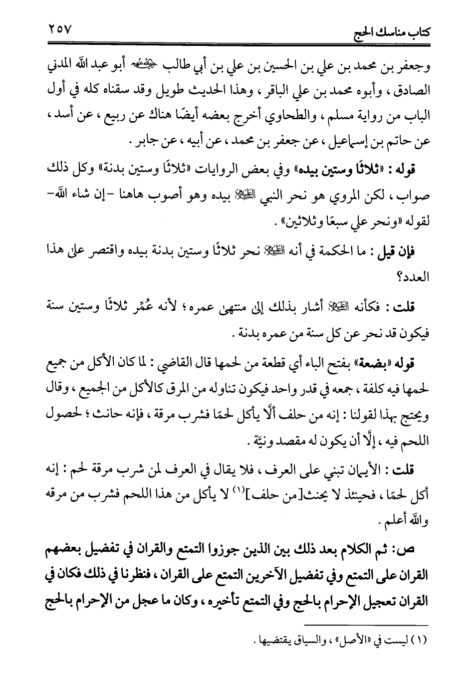 قوله: "ثلاثًا وستين بيده" وفي بعض الروايات "ثلاثاً وستين بدنة" وكل ذلك صواب، لكن المروي هو نحر النبي -عليه السلام- بيده وهو أصوب ها هنا -إن شاء الله- لقوله "ونحر علي سبعًا وثلاثين".