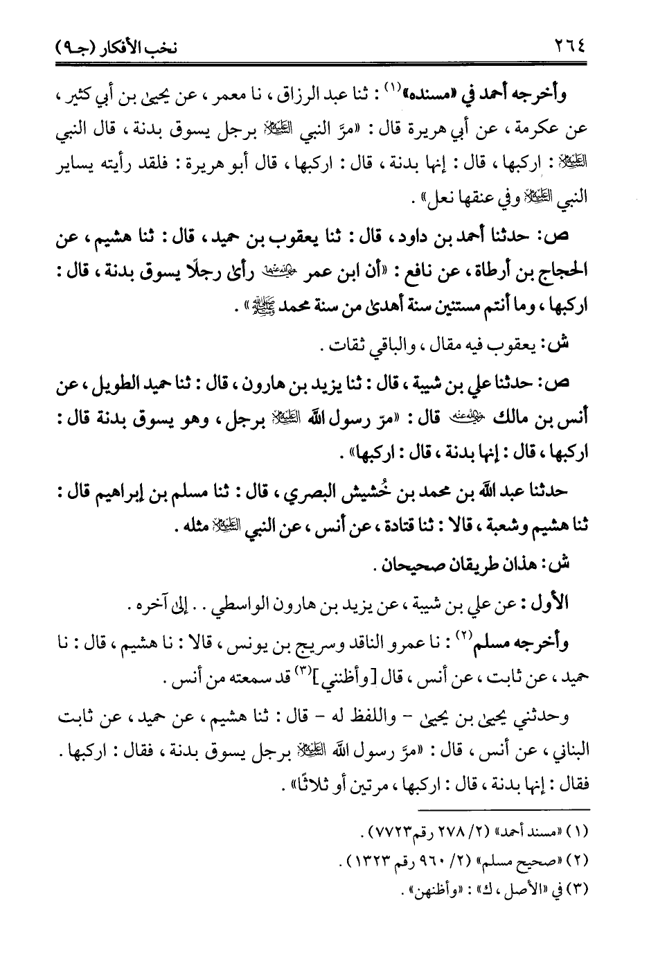 وحدثني يحيى بن يحيى -واللفظ له- قال: ثنا هشيم، عن حميد، عن ثابت البناني، عن أنس، قال: "مرَّ رسول الله -عليه السلام- برجل يسوق بدنة، فقال: اركبها.