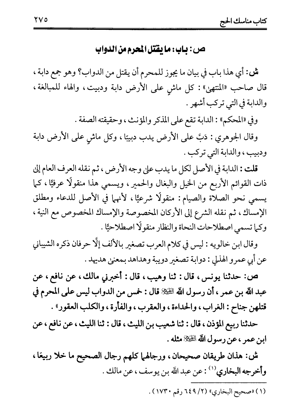 ش: أي هذا باب في بيان ما يجوز للمحرم أن يقتل من الدواب؟ وهو جمع دابة، قال صاحب "المنتهى": كل ماشٍ على الأرض دابة ودبيت، والهاء للمبالغة، والدابة في التي تركب أشهر.