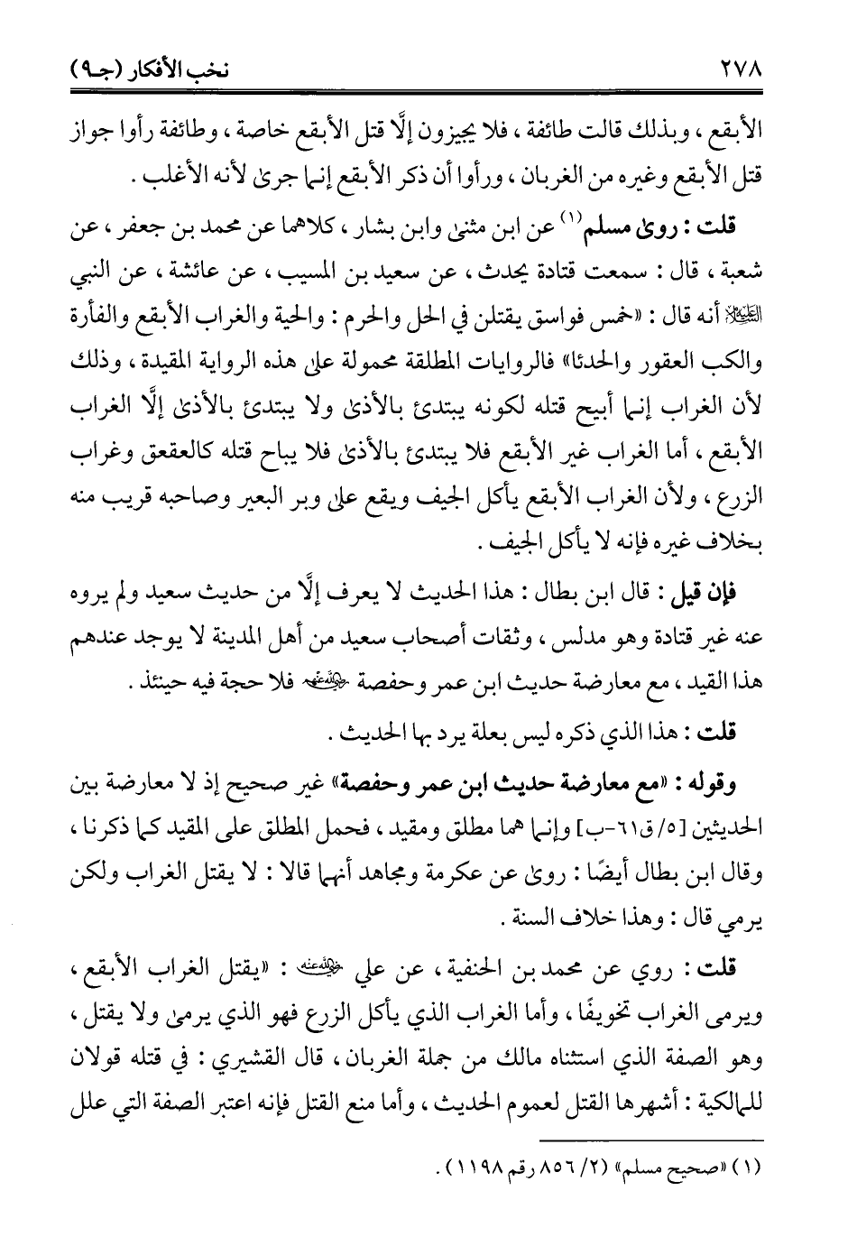 قلت: روى مسلم (¬1) عن ابن مثنى وابن بشار، كلاهما عن محمد بن جعفر، عن شعبة، قال: سمعت قتادة يحدث، عن سعيد بن المسيب، عن عائشة، عن النبي -عليه السلام- أنه قال: "خمس فواسق يقتلن في الحل والحرم: والحية والغراب الأبقع والفأرة والكلب العقور والحدئا" فالروايات المطلقة محمولة على هذه الرواية المقيدة، وذلك لأن الغراب إنما أبيح قتله لكونه يبتدئ بالأذى ولا يبتدئ بالأذى إلَّا الغراب الأبقع، أما الغراب غير الأبقع فلا يبتدئ بالأذى فلا يباح قتله كالعقعق وغراب الزرع، ولأن الغراب الأبقع يأكل الجيف ويقع على وبر البعير وصاحبه قريب منه بخلاف غيره فإنه لا يأكل الجيف.