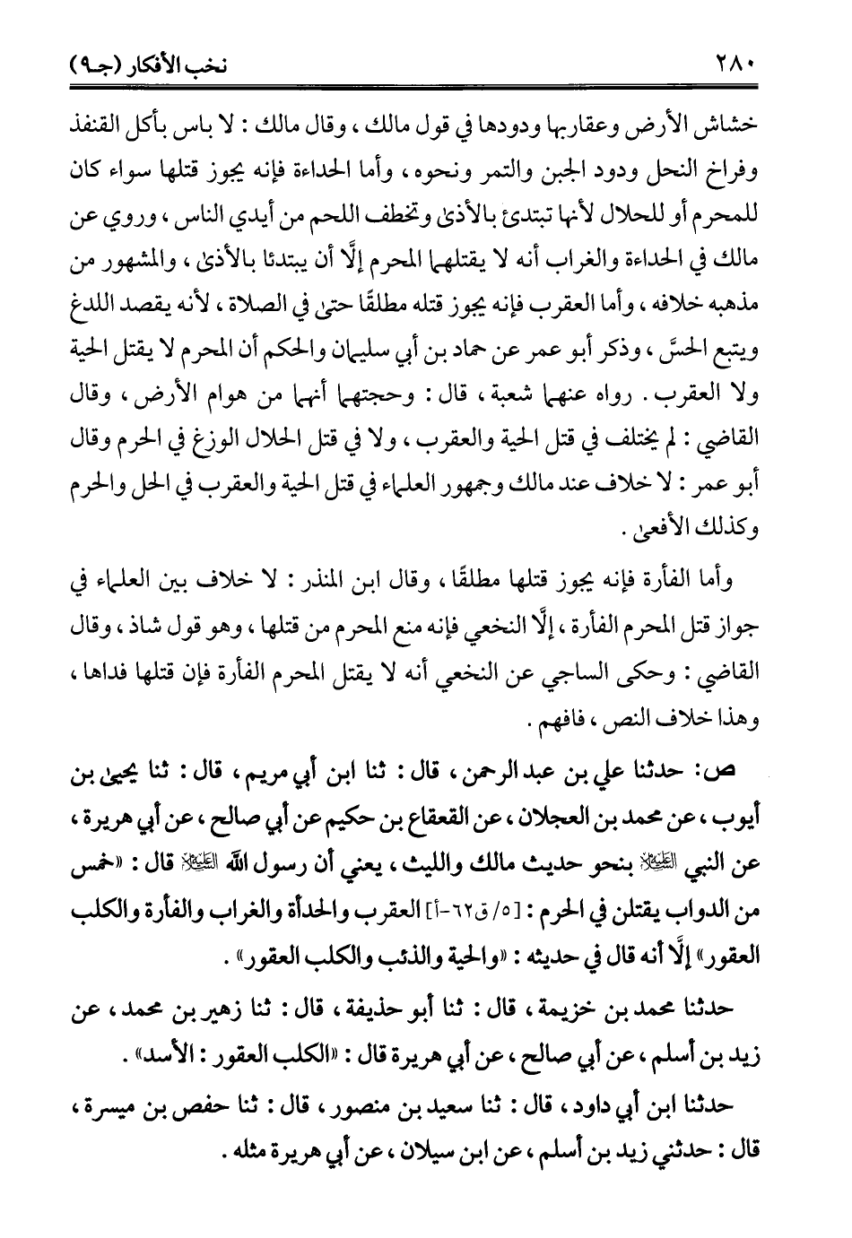 خشاش الأرض وعقاربها ودودها في قول مالك، وقال مالك: لا بأس بأكل القنفذ وفراخ النحل ودود الجبن والتمر ونحوه، وأما الحداءة فإنه يجوز قتلها سواء كان للمحرم أو للحلال لأنها تبتدئ بالأذى وتخطف اللحم من أيدي الناس، وروي عن مالك في الحداءة والغراب أنه لا يقتلهما المحرم إلَّا أن يبتدئا بالأذى، والمشهور من مذهبه خلافه، وأما العقرب فإنه يجوز قتله مطلقًا حتى في الصلاة، لأنه يقصد اللدغ ويتبع الحسَّ، وذكر أبو عمر عن حماد بن أبي سليمان والحكم أن المحرم لا يقتل الحية ولا العقرب. رواه عنهما شعبة، قال: وحجتهما أنهما من هوام الأرض، وقال القاضي: لم يختلف في قتل الحية والعقرب، ولا في قتل الحلال الوزغ في الحرم وقال أبو عمر: لا خلاف عند مالك وجمهور العلماء في قتل الحية والعقرب في الحل والحرم وكذلك الأفعى.