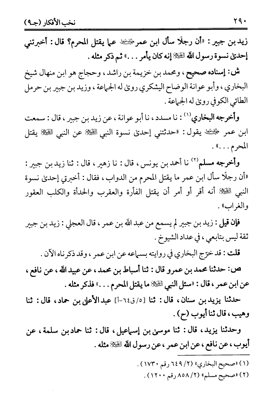 زيد بن جبير: "أن رجلاً سأل ابن عمر -رضي الله عنهما- عما يقتل المحرم؟ قال: أخبرتني إحدى نسوة رسول الله -عليه السلام- إنه كان يأمر ... " ثم ذكر مثله.