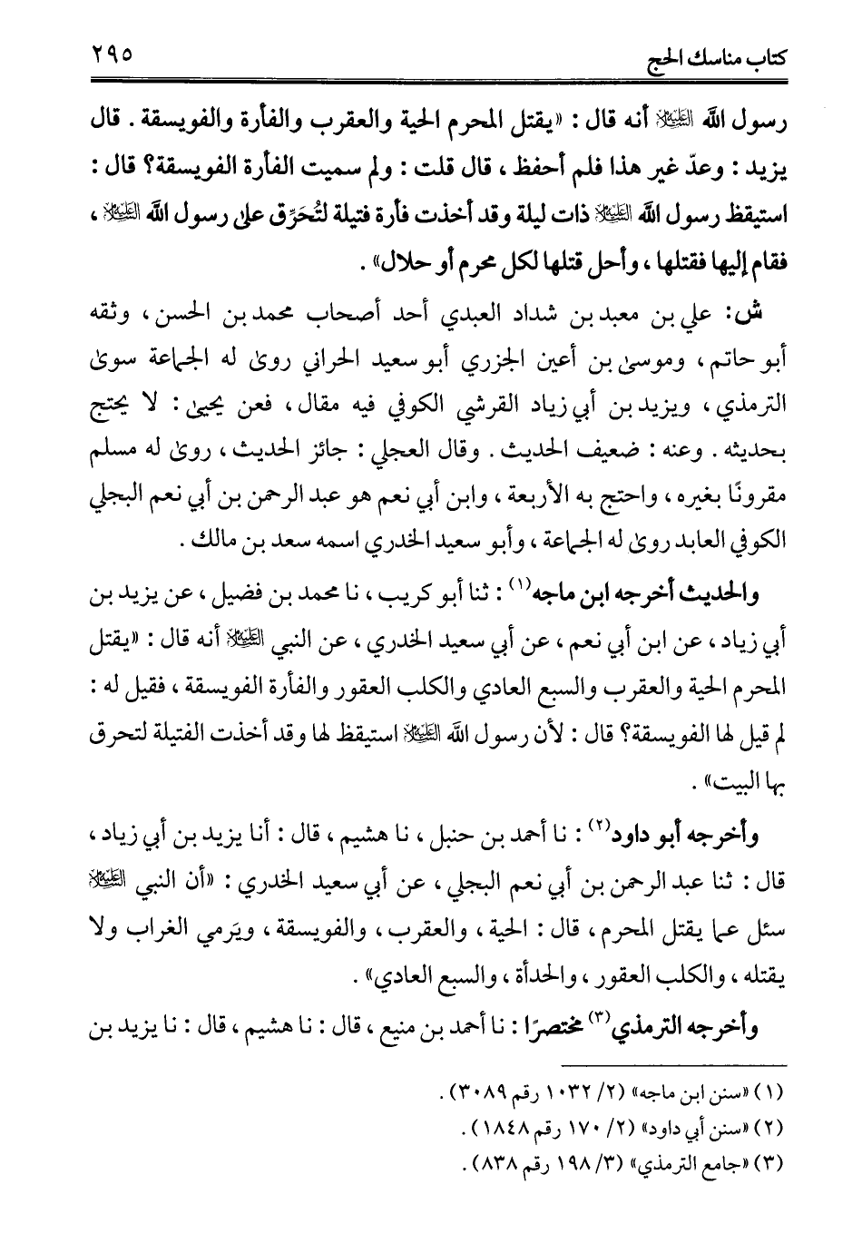 رسول الله -عليه السلام- أنه قال: "يقتل المحرم الحية والعقرب والفأرة والفويسقة. قال يزيد: وعدّ غير هذا فلم أحفظ، قال قلت: ولم سميت الفأرة الفويسقة؟ قال: استيقظ رسول الله -عليه السلام- ذات ليلة وقد أخذت فأرة فتيلة لتُحَرِّق على رسول الله -عليه السلام-، فقام إليها فقتلها، وأحل قتلها لكل محرم أو حلال".