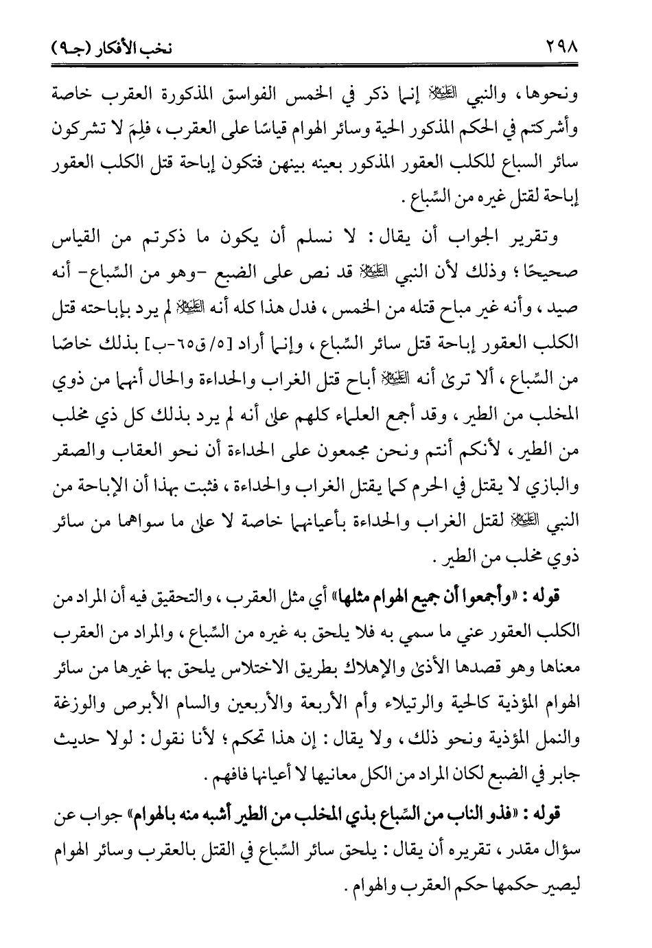 وتقرير الجواب أن يقال: لا نسلم أن يكون ما ذكرتم من القياس صحيحًا؛ وذلك لأن النبي -عليه السلام- قد نص على الضبع -وهو من السِّباع- أنه صيد، وأنه غير مباح قتله من الخمس، فدل هذا كله أنه -عليه السلام- لم يرد بإباحته قتل الكلب العقور إباحة قتل سائر السِّباع، وإنما أراد بذلك خاصًا من السِّباع، ألا ترى أنه -عليه السلام- أباح قتل الغراب والحداءة والحال أنهما من ذوي المخلب من الطير، وقد أجمع العلماء كلهم على أنه لم يرد بذلك كل ذي مخلب من الطير، لأنكم أنتم ونحن مجمعون على الحداءة أن نحو العقاب والصقر والبازي لا يقتل في الحرم كما يقتل الغراب والحداءة، فثبت بهذا أن الإِباحة من النبي -عليه السلام- لقتل الغراب والحداءة بأعيانهما خاصة لا على ما سواهما من سائر ذوي مخلب من الطير.