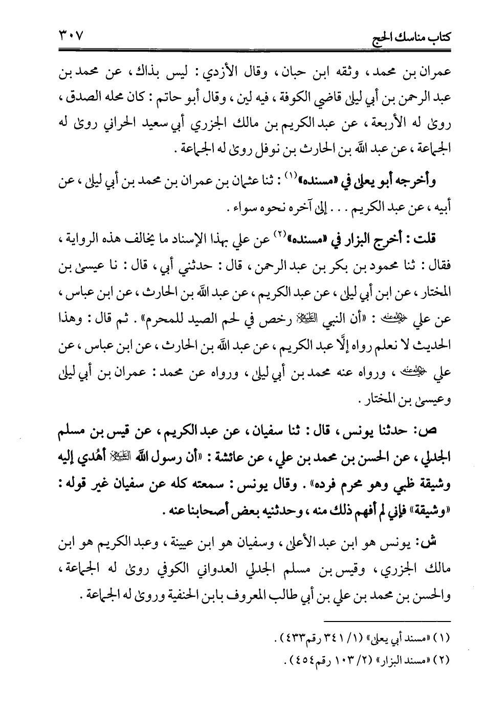 ش: يونس هو ابن عبد الأعلى، وسفيان هو ابن عيينة، وعبد الكريم هو ابن مالك الجزري، وقيس بن مسلم الجدلي العدواني الكوفي روى له الجماعة، والحسن بن محمد بن علي بن أبي طالب المعروف بابن الحنفية وروى له الجماعة.