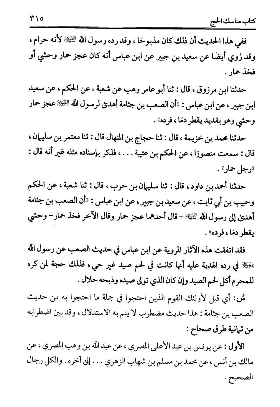 حدثنا أحمد بن داود، قال: ثنا سليمان بن حرب، قال: ثنا شعبة، عن الحكم وحبيب بن أبي ثابت، عن سعيد بن جبير، عن ابن عباس: "أن الصعب بن جثامة أهدى إلى رسول الله -عليه السلام-قال أحدهما عجز حمار وقال الآخر فخذ حمار- وحشي يقطر دمًا، فرده".