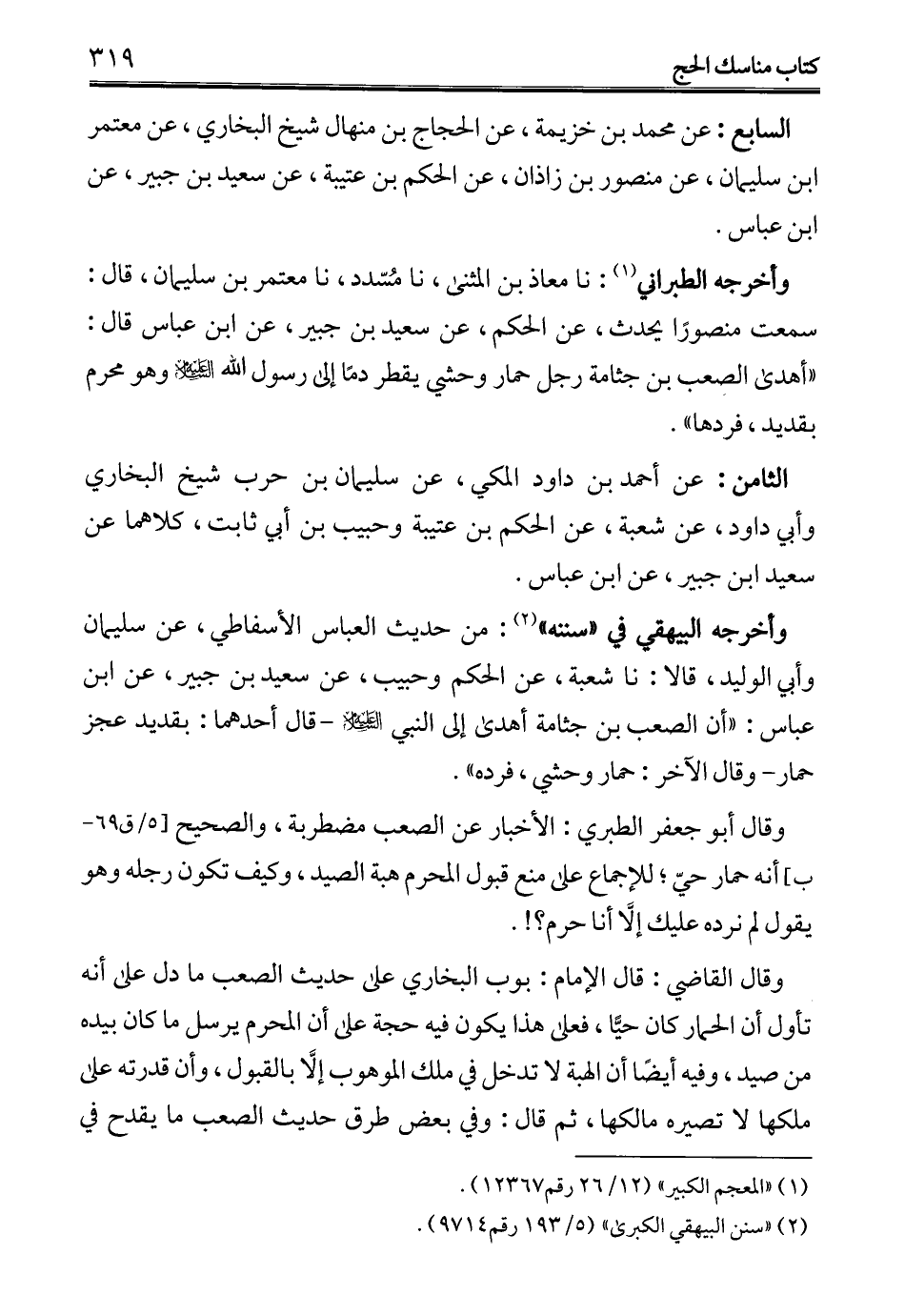 وأخرجه الطبراني (¬1): نا معاذ بن المثنى، نا مُسّدد، نا معتمر بن سليمان، قال: سمعت منصورًا يحدث، عن الحكم، عن سعيد بن جبير، عن ابن عباس قال: "أهدى الصعب بن جثامة رجل حمار وحشي يقطر دمًا إلى رسول الله -عليه السلام- وهو محرم بقديد، فردها".