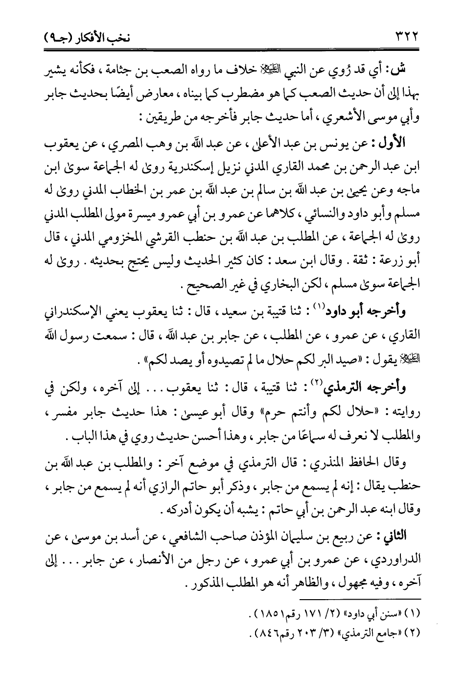 وأخرجه الترمذي (¬2): ثنا قتيبة، قال: ثنا يعقوب ... إلى آخره، ولكن في روايته: "حلال لكم وأنتم حرم" وقال أبو عيسى: هذا حديث جابر مفسر، والمطلب لا نعرف له سماعًا من جابر، وهذا أحسن حديث روي في هذا الباب.