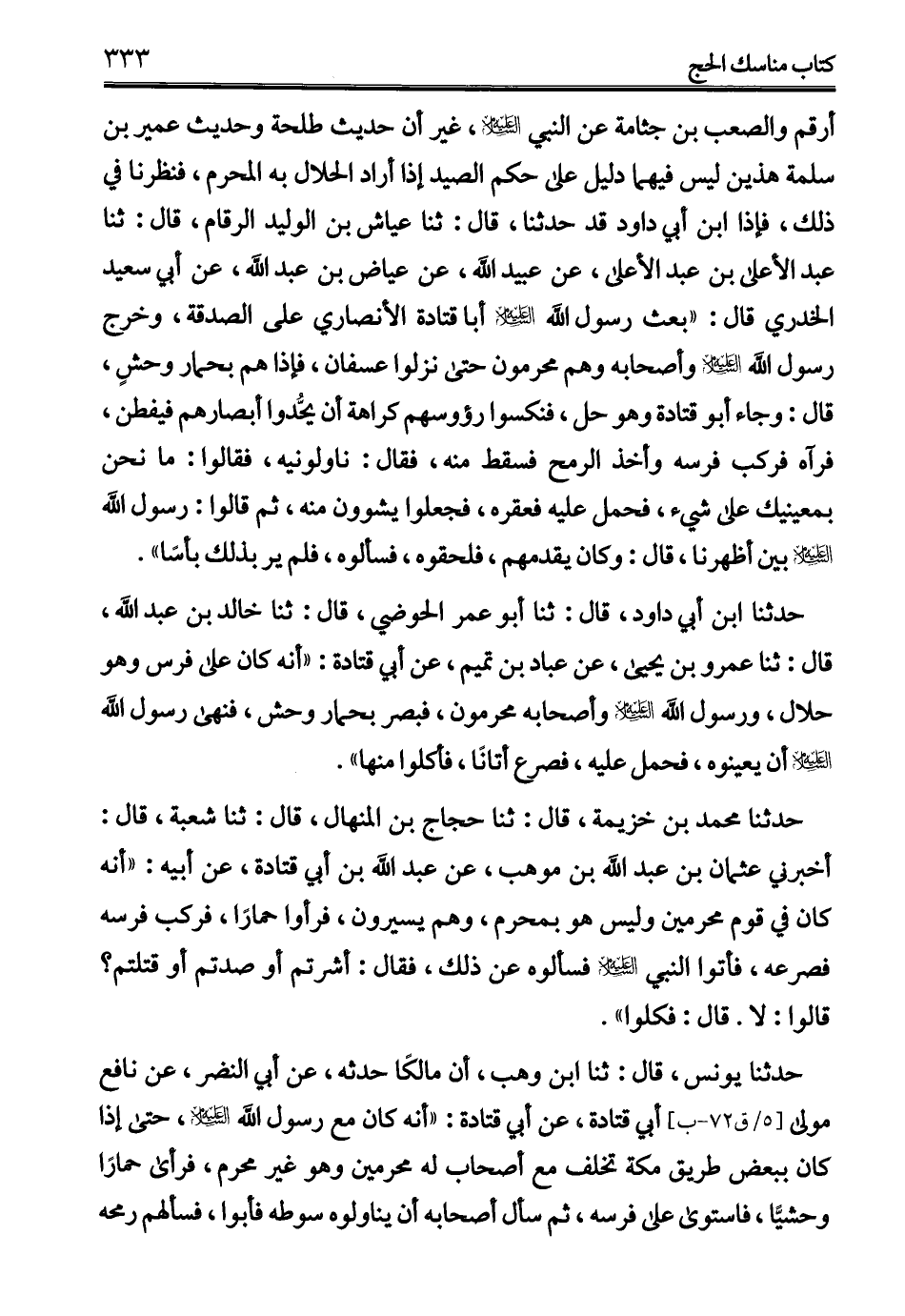 حدثنا ابن أبي داود، قال: ثنا أبو عمر الحوضي، قال: ثنا خالد بن عبد الله، قال: ثنا عمرو بن يحيى، عن عباد بن تميم، عن أبي قتادة: "أنه كان على فرس وهو حلال، ورسول الله -عليه السلام- وأصحابه محرمون، فبصر بحمار وحش، فنهى رسول الله -عليه السلام- أن يعينوه، فحمل عليه، فصرع أتانًا، فأكلوا منها".