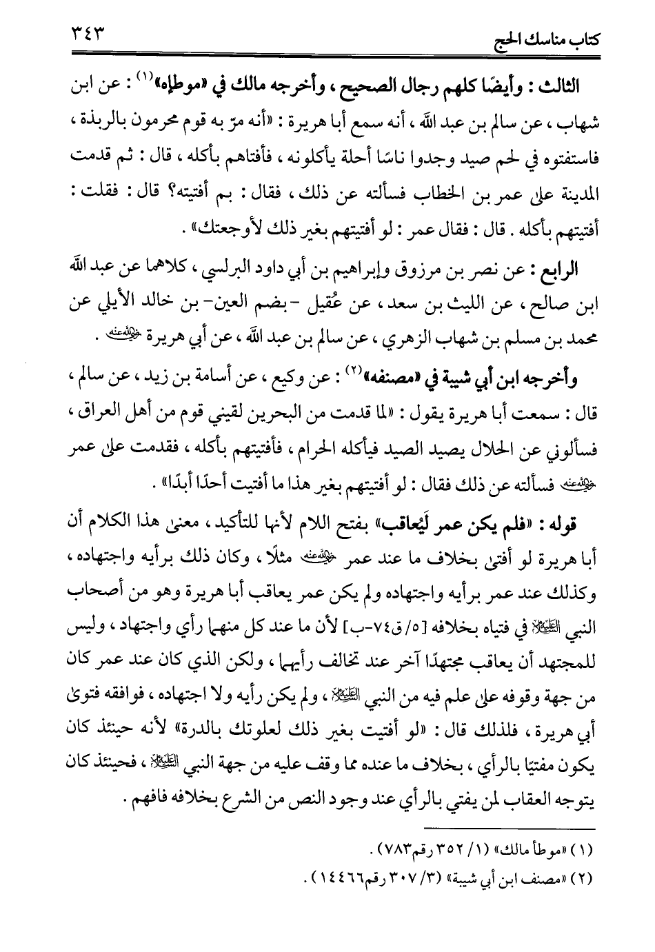 الثالث: وأيضًا كلهم رجال الصحيح، وأخرجه مالك في "موطإه" (¬1): عن ابن شهاب، عن سالم بن عبد الله، أنه سمع أبا هريرة: "أنه مرّ به قوم محرمون بالربذة، فاستفتوه في لحم صيد وجدوا ناسًا أحلة يأكلونه، فأفتاهم بأكله، قال: ثم قدمت المدينة على عمر بن الخطاب فسألته عن ذلك، فقال: بم أفتيته؟ قال: فقلت: أفتيتهم بأكله. قال: فقال عمر: لو أفتيتهم بغير ذلك لأوجعتك".