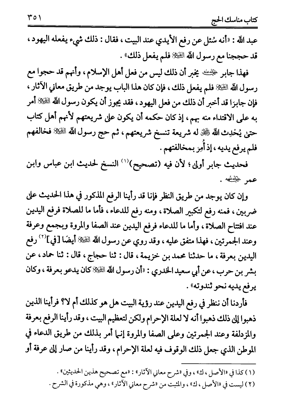 فهذا جابر -رضي الله عنه- يخبر أن ذلك ليس من فعل أهل الإِسلام، وأنهم قد حجوا مع رسول الله -عليه السلام- فلم يفعل ذلك، فإن كان هذا الباب يوجد من طريق معاني الآثار، فإن جابرًا قد أخبر أن ذلك من فعل اليهود، فقد يجوز أن يكون رسول الله -عليه السلام- أمر به على الاقتداء منه بهم، إذ كان حكمه أن يكون على شريعتهم لأنهم أهل كتاب حتى يُحْدِث الله -عز وجل- له شريعة تنسخ شريعتهم، ثم حج رسول الله -عليه السلام- فخالفهم فلم يرفع يديه، إذ أُمِرَ بمخالفتهم.