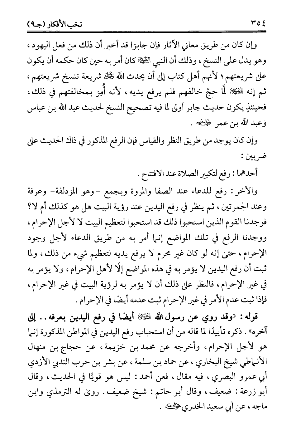 وإن كان من طريق معاني الآثار فإن جابرًا قد أخبر أن ذلك من فعل اليهود، وهو يدل على النسخ، وذلك أن النبي -عليه السلام- كان أمر به حين كان حكمه أن يكون على شريعتهم؛ لأنهم أهل كتاب إلى أن يحدث الله -عز وجل- شريعة تنسخ شريعتهم، ثم إنه -عليه السلام- لمَّا حجَّ خالفهم فلم يرفع يديه، لأنه أُمِرَ بمخالفتهم في ذلك، فحينئذٍ يكون حديث جابر أولى لما فيه تصحيح النسخ لحديث عبد الله بن عباس وعبد الله بن عمر -رضي الله عنهم-.