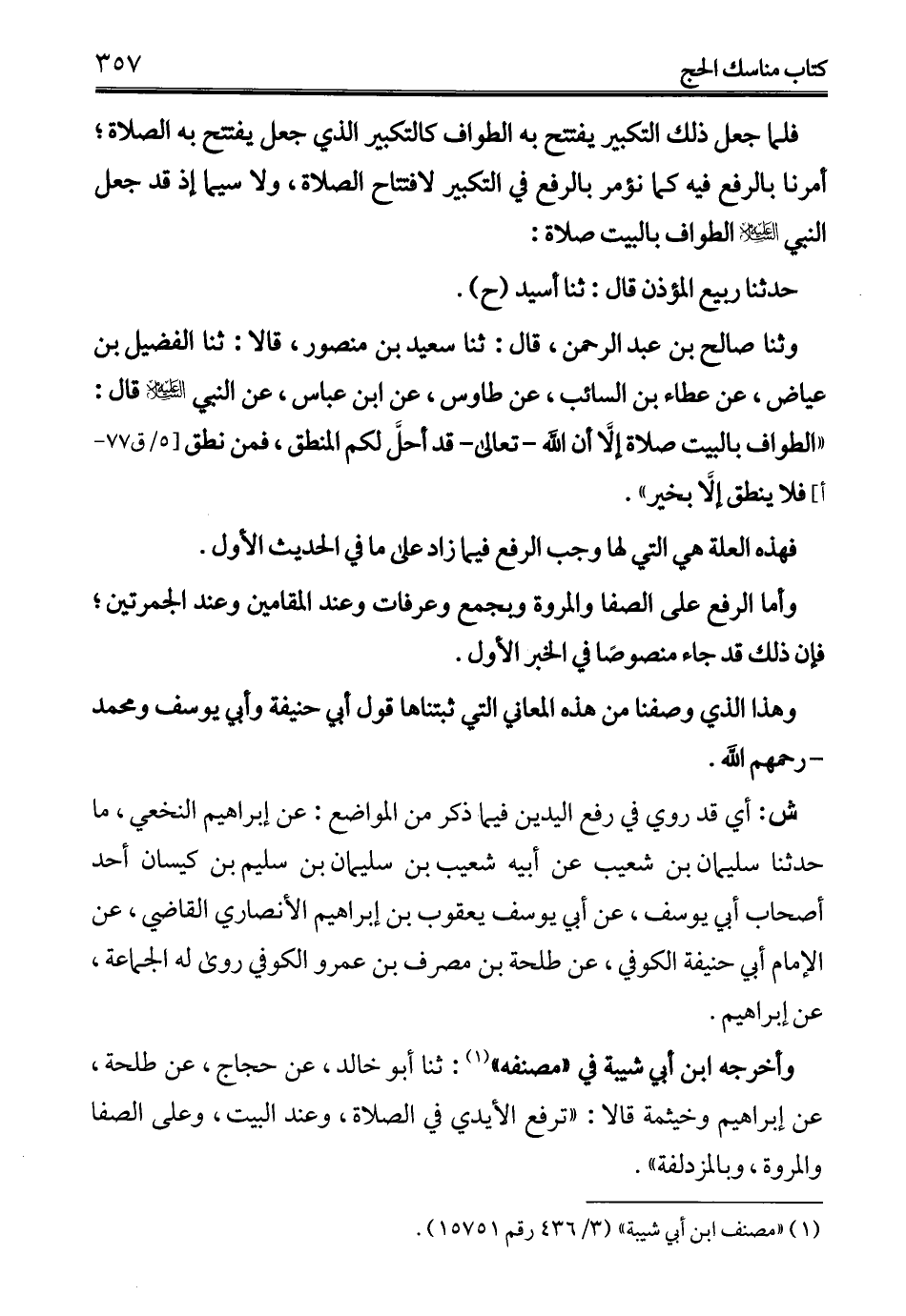 وثنا صالح بن عبد الرحمن، قال: ثنا سعيد بن منصور، قالا: ثنا الفضيل بن عياض، عن عطاء بن السائب، عن طاوس، عن ابن عباس، عن النبي -عليه السلام- قال: "الطواف بالبيت صلاة إلَّا أن الله -تعالى- قد أحلَّ لكم المنطق، فمن نطق فلا ينطق إلَّا بخير".