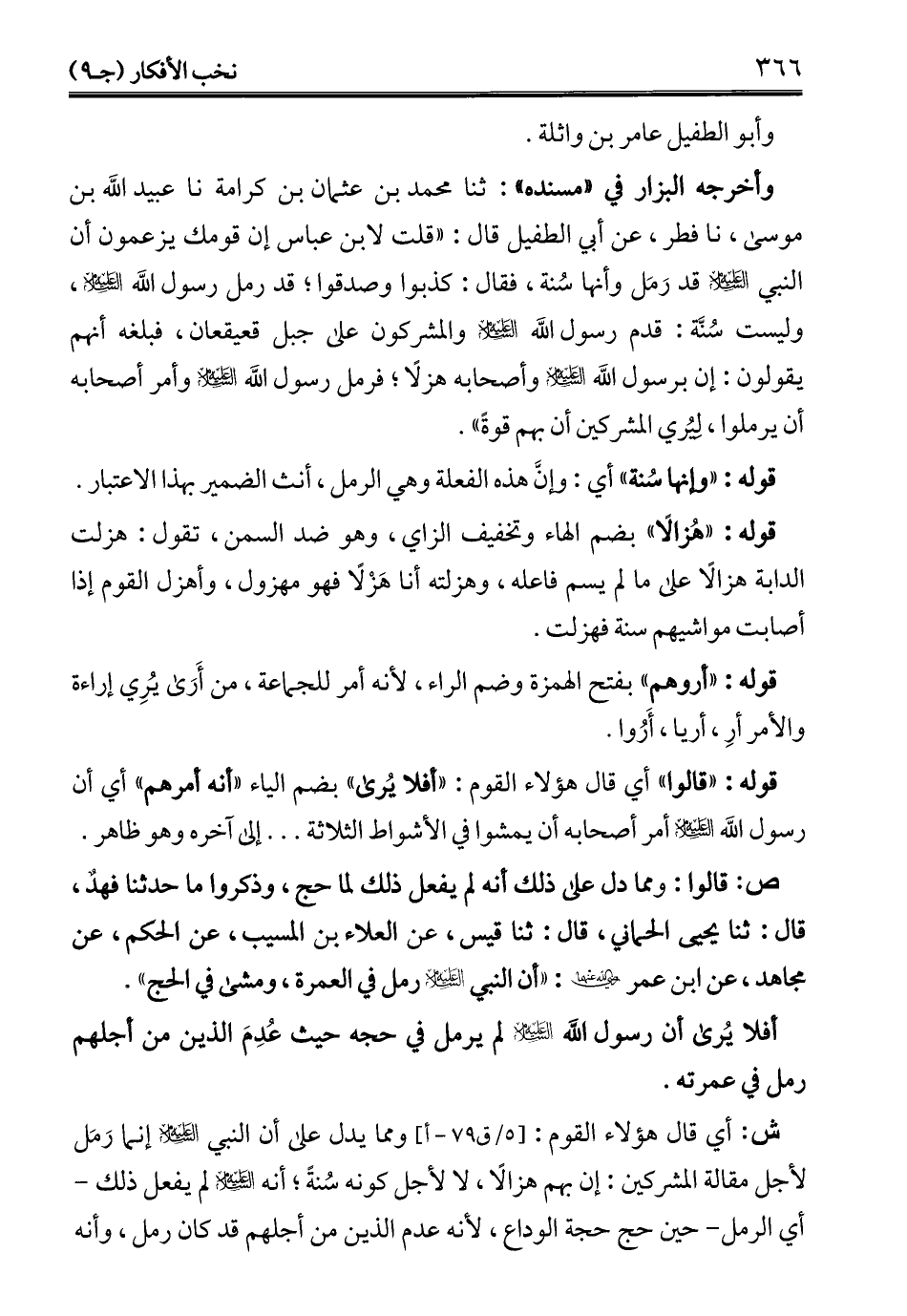 وأخرجه البزار في "مسنده": ثنا محمد بن عثمان بن كرامة نا عبيد الله بن موسى، نا فطر، عن أبي الطفيل قال: "قلت لابن عباس إن قومك يزعمون أن النبي -عليه السلام- قد رَمَل وأنها سُنة، فقال: كذبوا وصدقوا؛ قد رمل رسول الله -عليه السلام-، وليست سُنَّة: قدم رسول الله -عليه السلام- والمشركون على جبل قعيقعان، فبلغه أنهم يقولون: إن برسول الله -عليه السلام- وأصحابه هزلًا؛ فرمل رسول الله -عليه السلام- وأمر أصحابه أن يرملوا، لِيُري المشركين أن بهم قوةً".