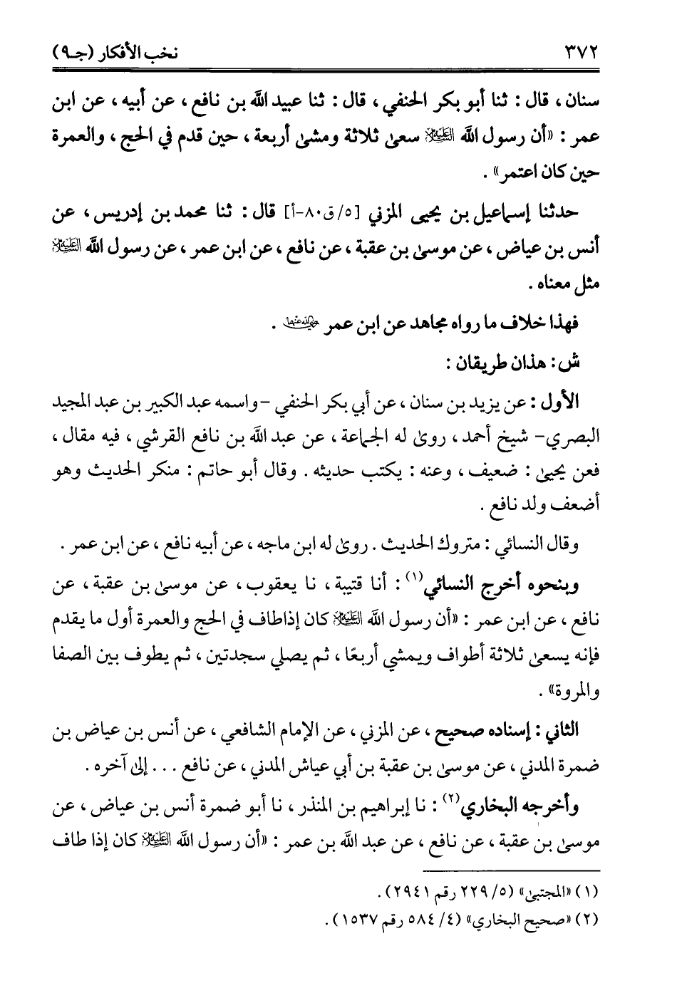 سنان، قال: ثنا أبو بكر الحنفي، قال: ثنا عبيد الله بن نافع، عن أبيه، عن ابن عمر: "أن رسول الله -عليه السلام- سعى ثلاثة ومشى أربعة، حين قدم في الحج، والعمرة حين كان اعتمر".